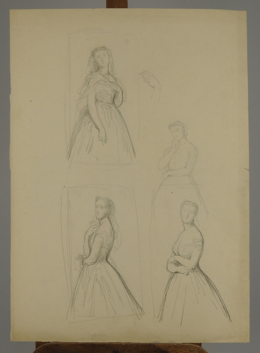 Joint : 4 études pour PORTRAITS de FEMME. 3 crayons et 1 sanguine sur papier. Grands formats, environ 60 x 45 cm. (papier plié pour l'un)