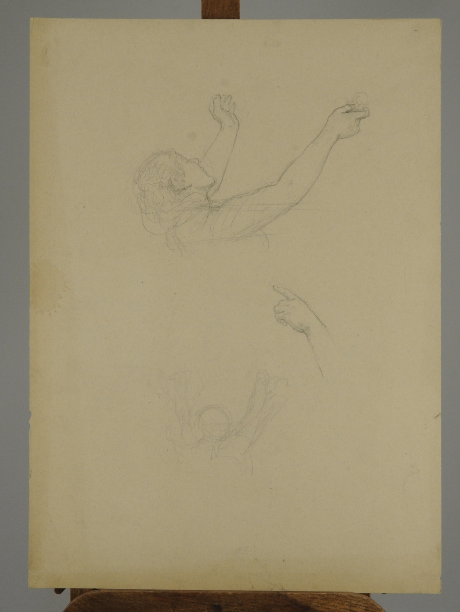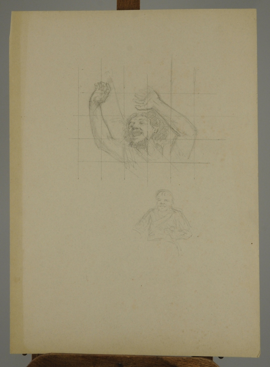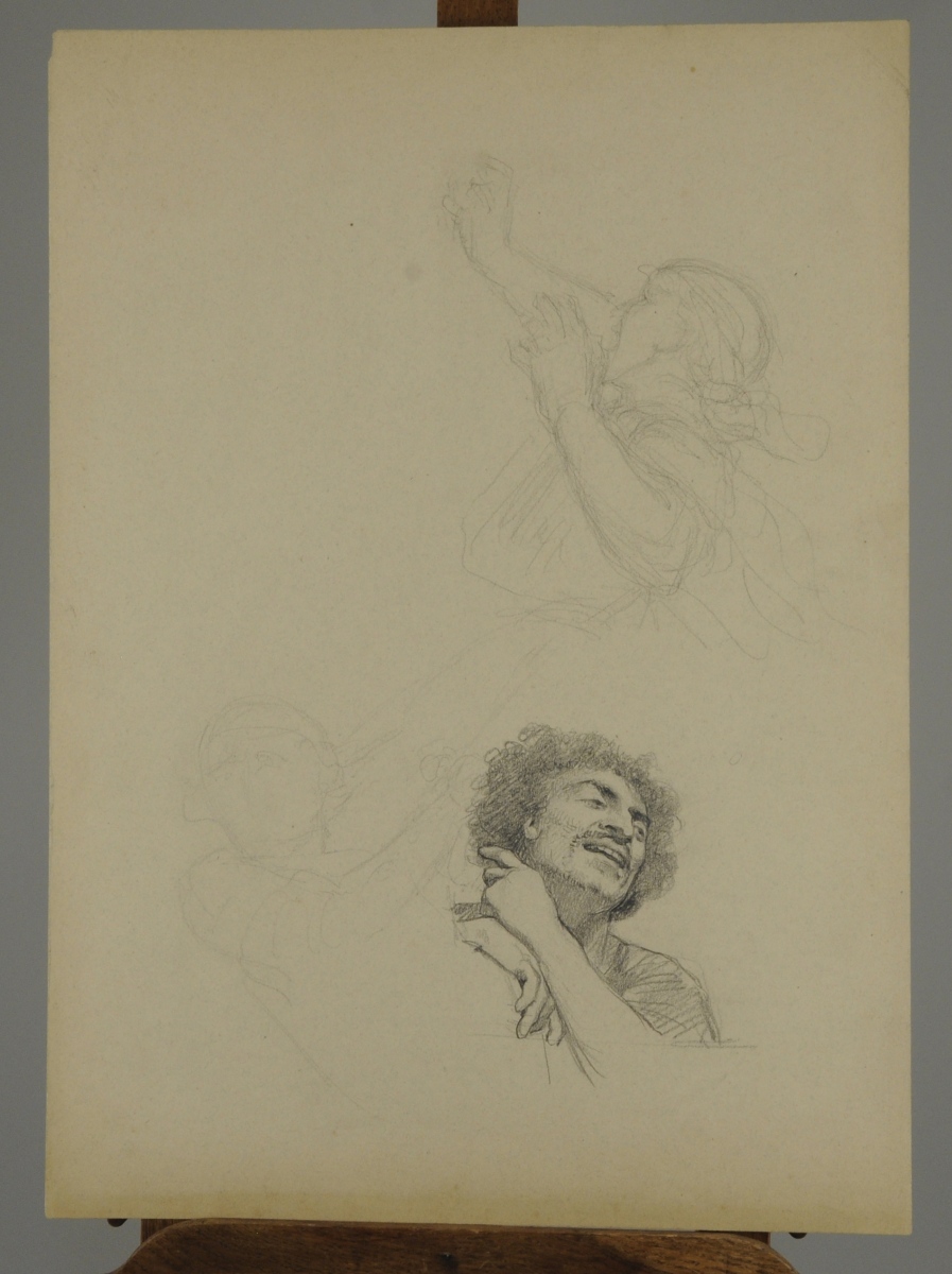 Études. 21 feuilles. Crayon, certains avec rehauts de craie blanche sur papier et deux crayons et rehauts de craie blanche sur calque. Certains annotés.