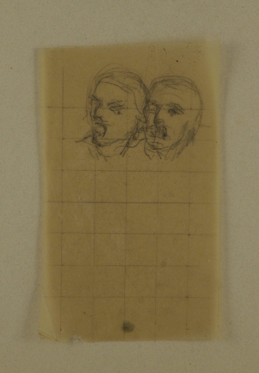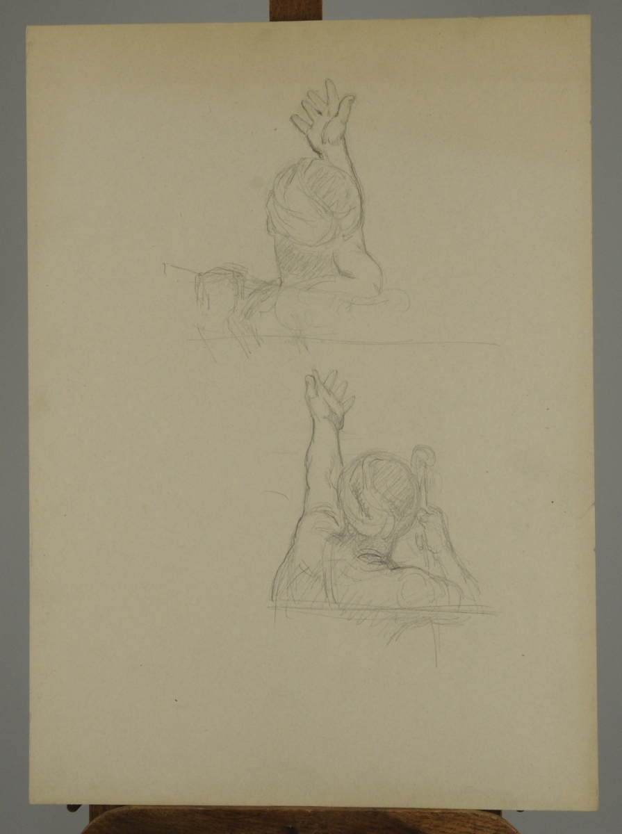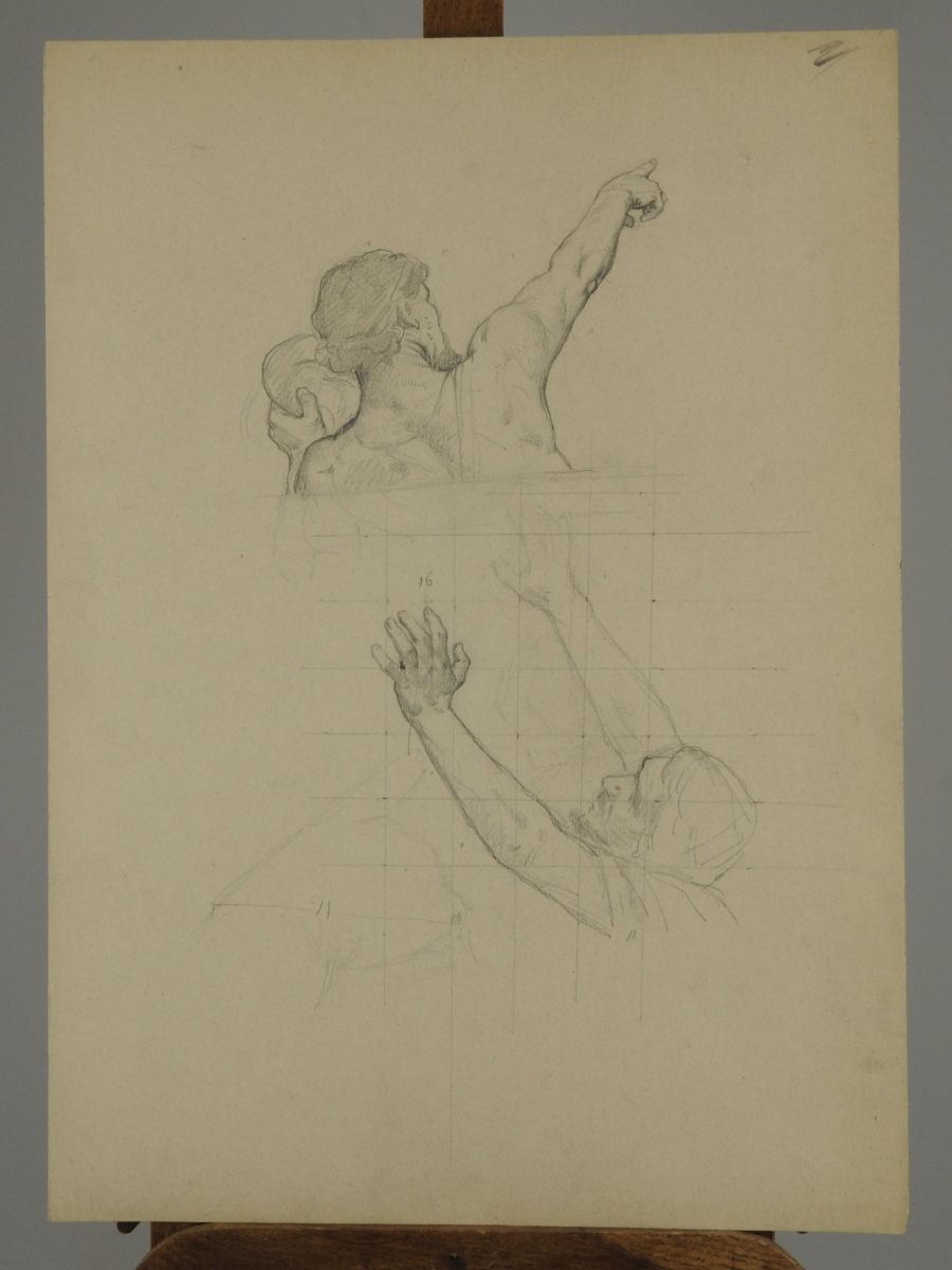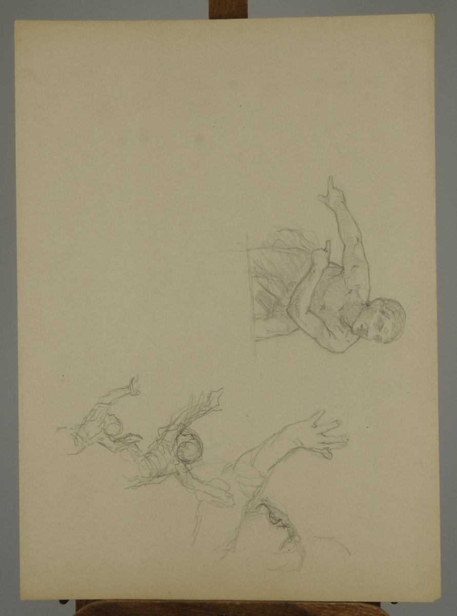 Études. 21 feuilles. Crayon, certains avec rehauts de craie blanche sur papier et deux crayons et rehauts de craie blanche sur calque. Certains annotés.