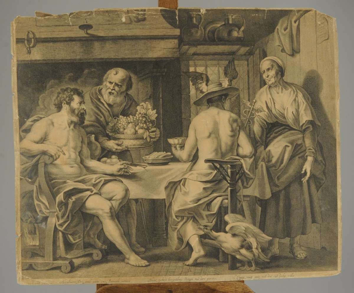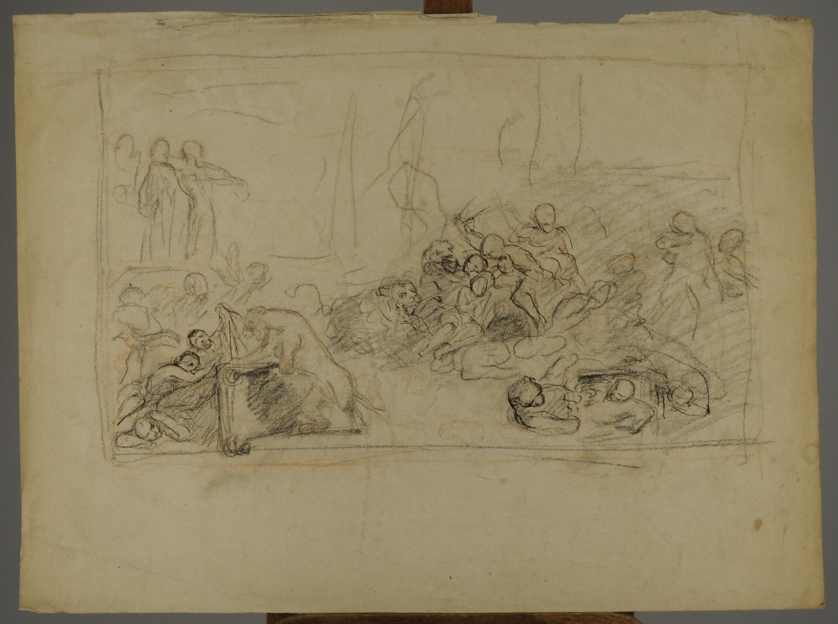 Études. 3 feuilles. 1 sanguine, 1 crayon noir et 1 crayon noir et sanguine sur papier. Au dos de l'une, une gravure d'après Jacob JORDAENS (1593-1678).