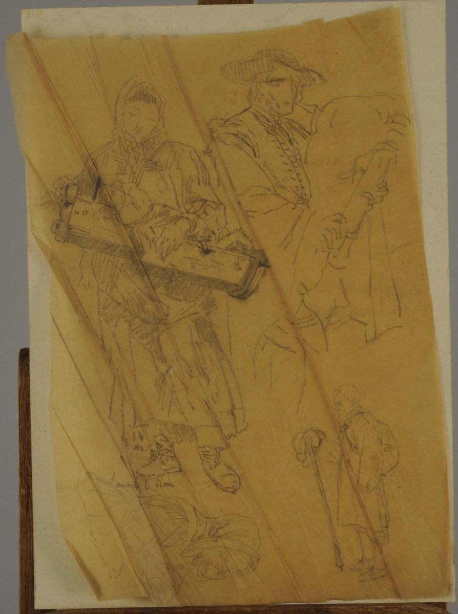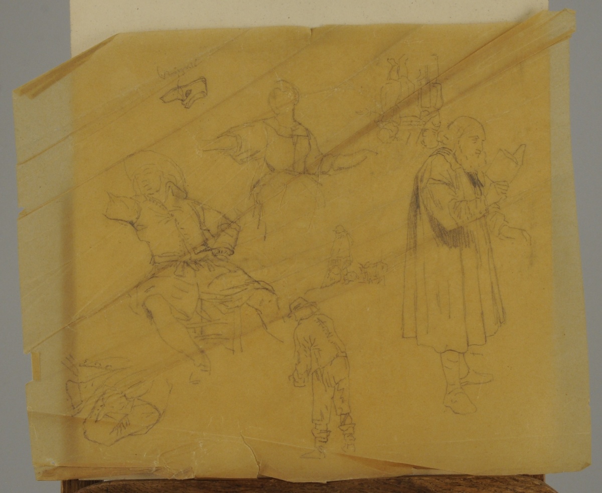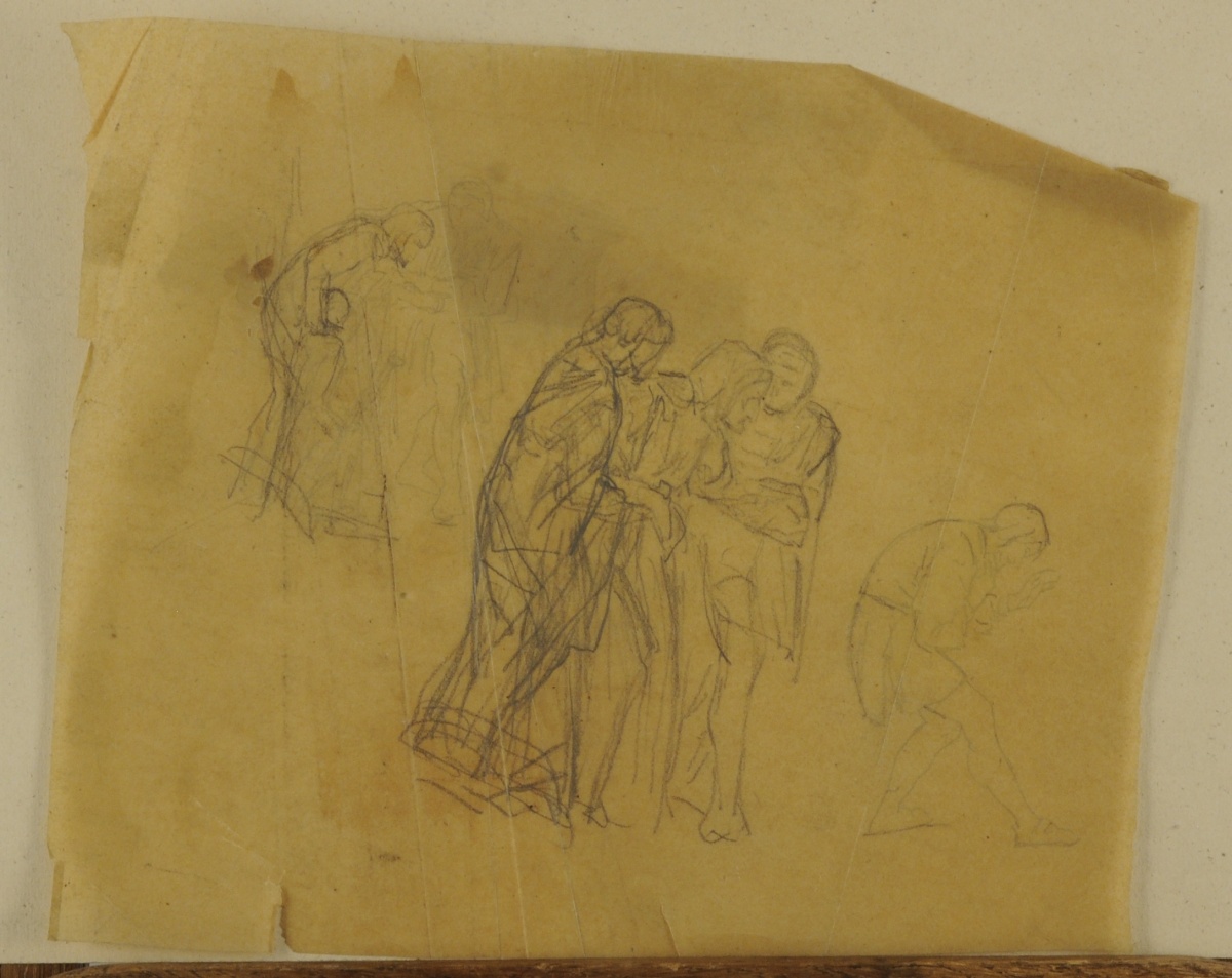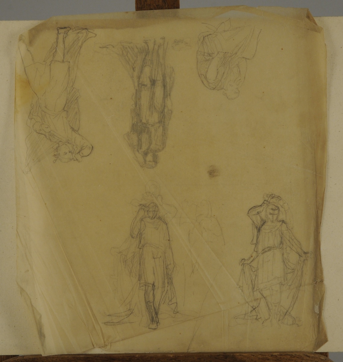 Joint : 9 ÉTUDES. 8 crayon sur calque et 1 crayon sur papier. 3 moyens formats, environ 30 x 25 et 6 petits formats, environ 20 x 15 cm. (papier plié, usures)