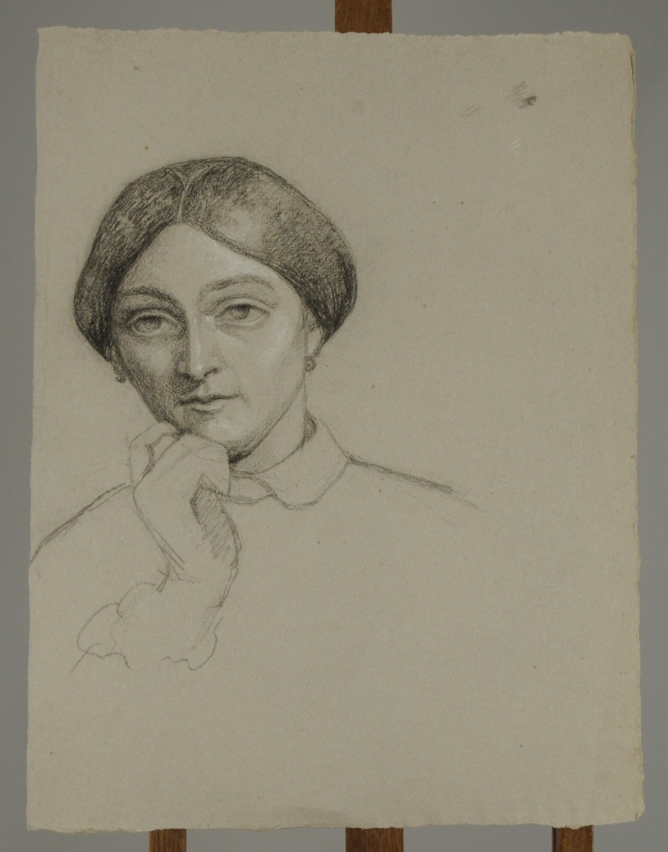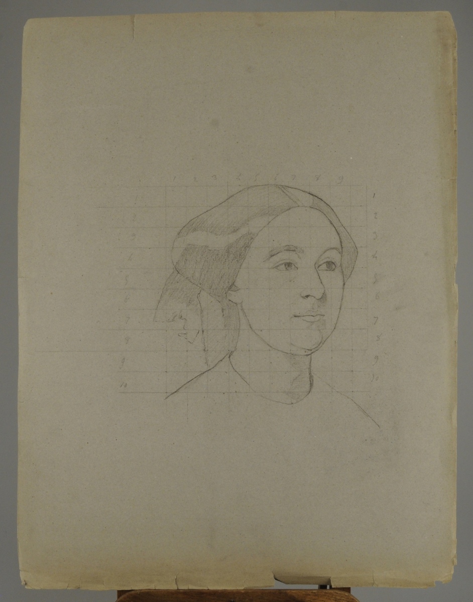Joint : Portrait de FEMME sur quadrillage préparatoire. Crayon sur papier. 64 x 49 cm.