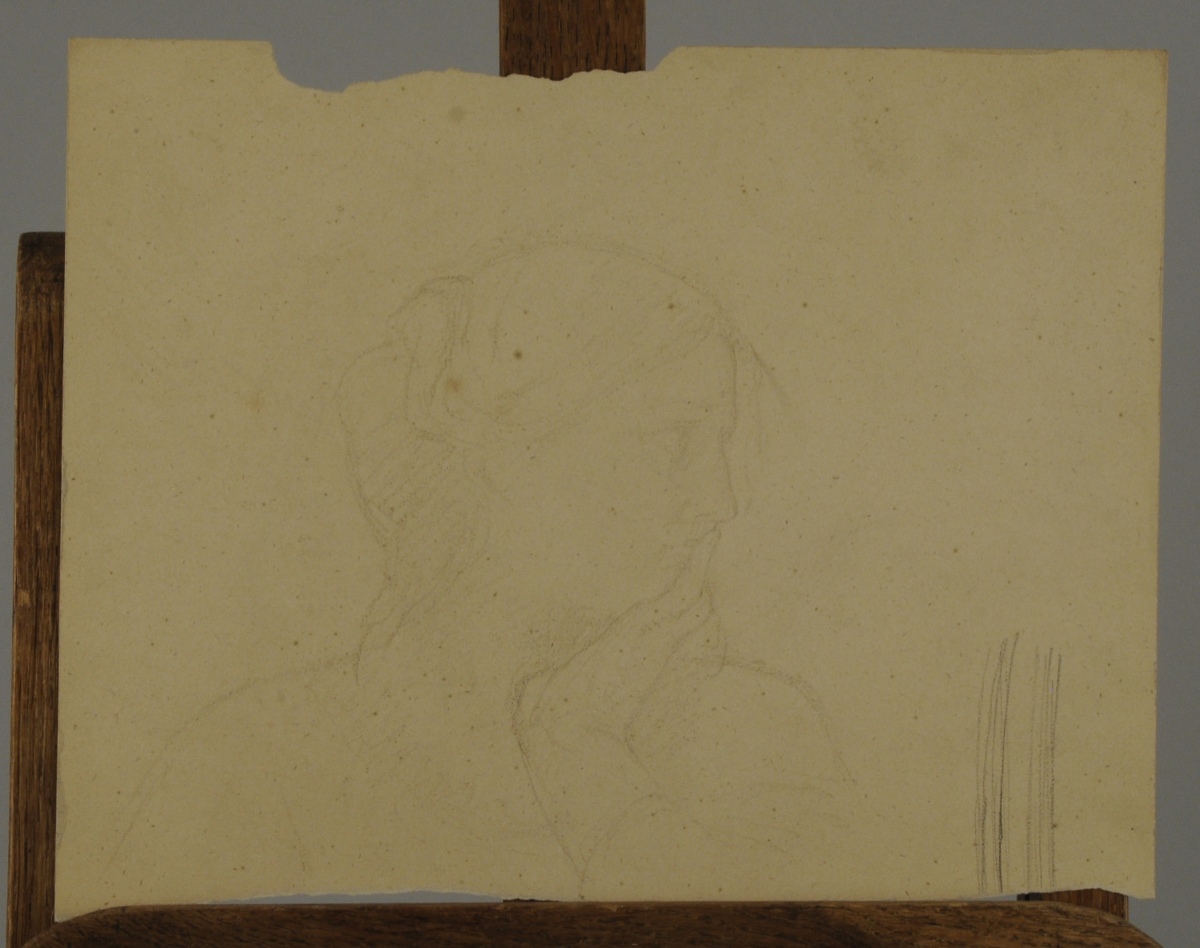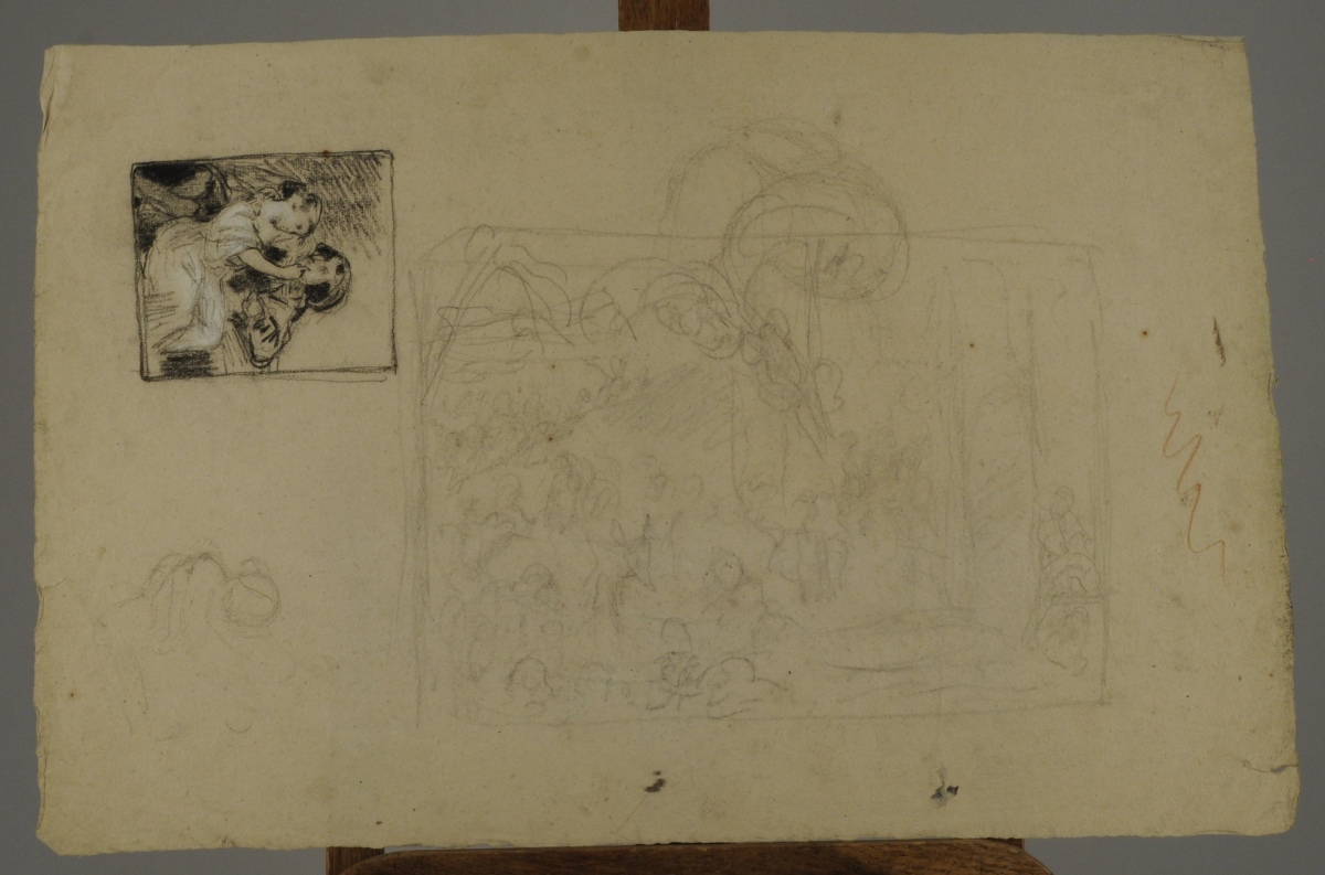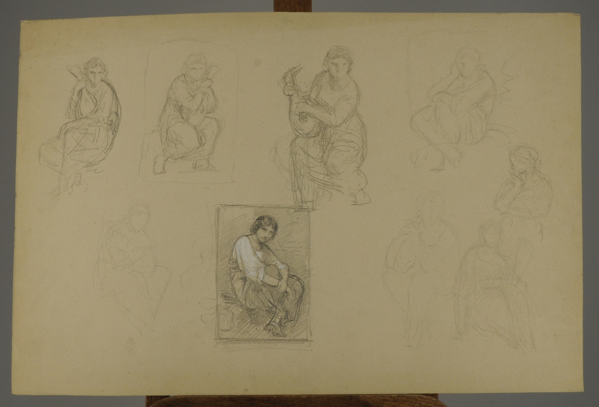 Études. 5 feuilles. Crayon et rehauts de craie sur papier et une sanguine sur papier, l'un annoté.