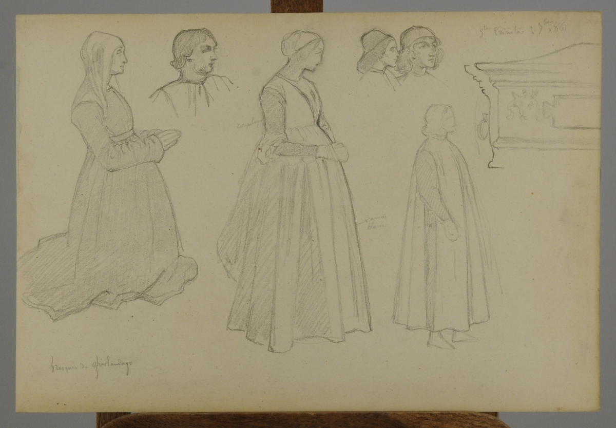 Études de femmes et esquisses dans le goût de la Renaissance italienne, la plupart d'après Andrea del Sarto, d'autres d'après Domenico Ghirlandaio et Gentileschi.