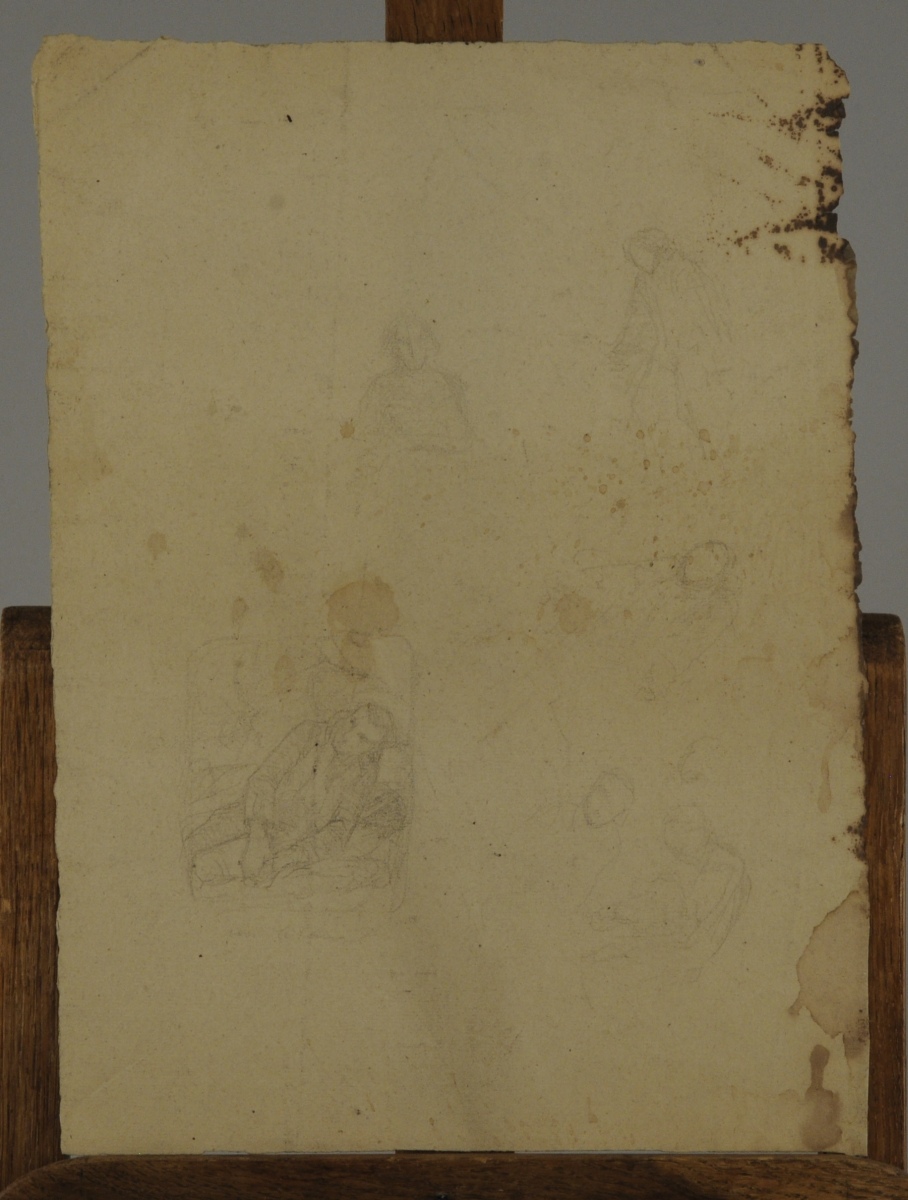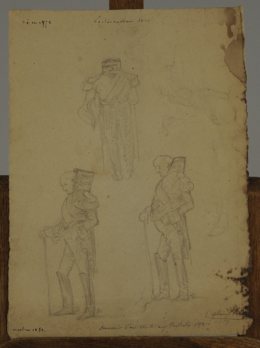 Études. 4 feuilles. Crayon sur papier, l'un rehaussé de craie blanche. L'un annoté "né en 1772 / Fontainebleau 1814 / meurt en 1852 / souvenir d'une visite aux Tuileries / général Petit".
