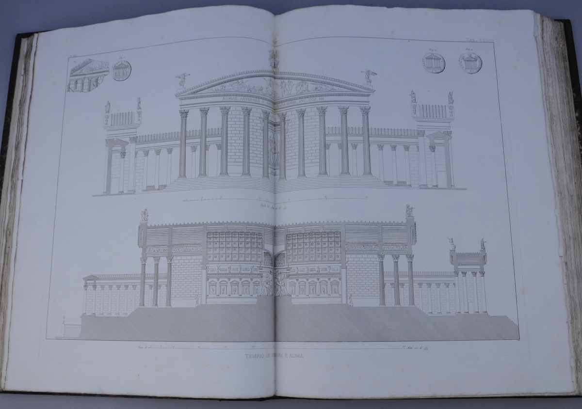 4 forts volumes grand in-folio (510 X 390 mm). Texte : 3 parties en 2 volumes de 172 pages, 271 pages et 236 pages. Atlas : 2 volumes contenant un plan topographique de la Rome Antique en 4 planches doubles (mesurant environ, une fois assemblé, 1350 X 1000 mm, et comptant comme planche I), 255 planches gravées dont un plan de Pompéi sur double page (numéroté II), soit en tout 259 planches numérotées 256, et VIII pages de tables. Solides reliures du milieu du XIXème siècle en 1/2 chagrin à coins. (Quelques minimes épidermures.).