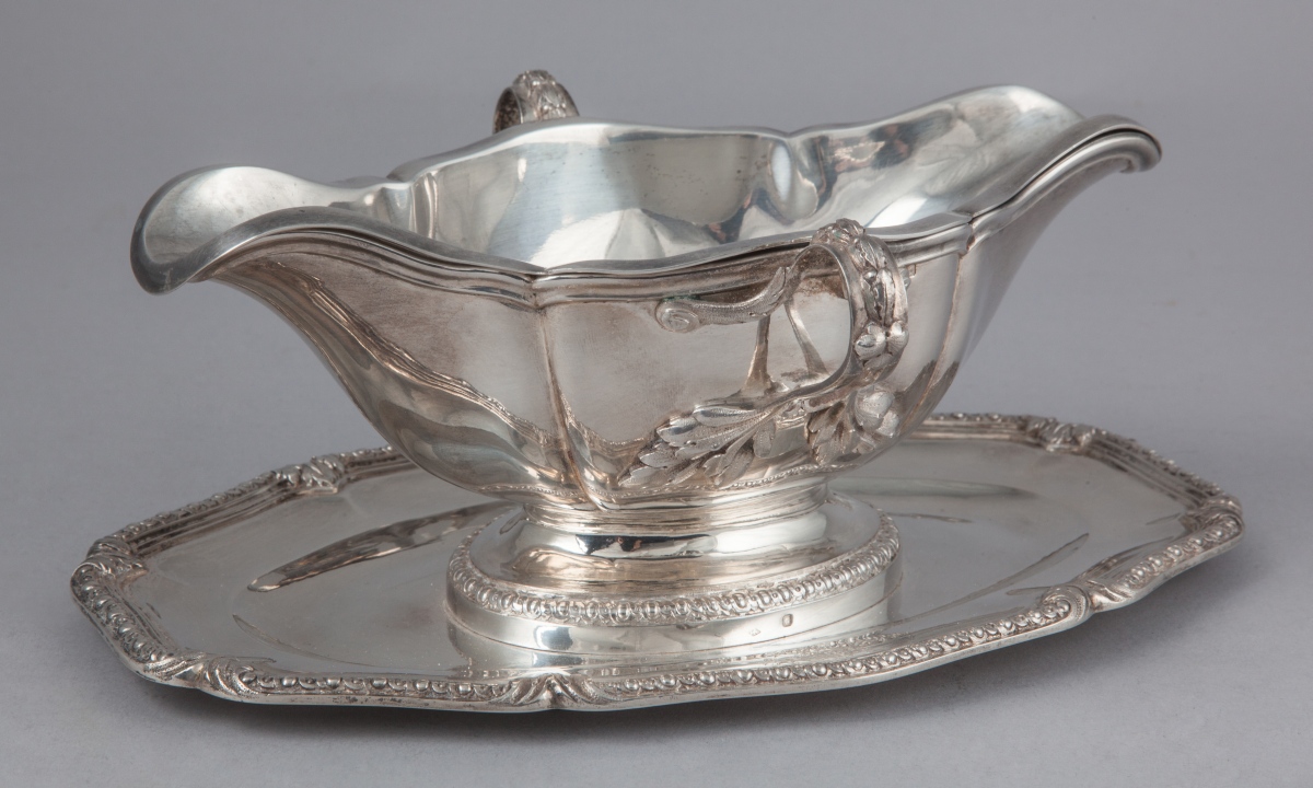 Cet ensemble comprend trois plats de forme ronde et un plat de forme ovale. La saucière, de forme ovale, est épaulée d'anses à attaches feuillagées et pose sur un plateau adhérent. (doublure en métal argenté).
