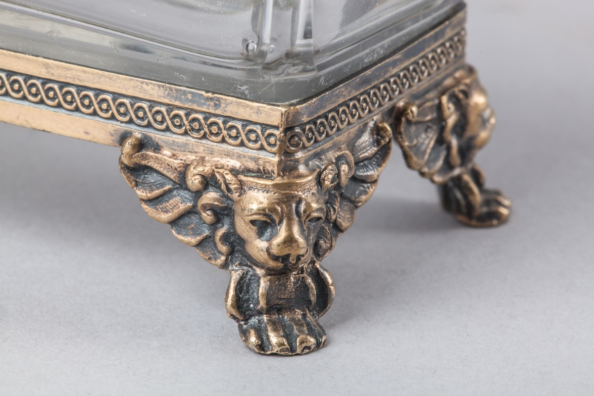 Dans une CAVE ancienne de forme rectangulaire en cristal, monture vermeil. Le couvercle ajouré monogrammé J et P dans deux cartouches fleuris de forme losangique. La base ornée d'une