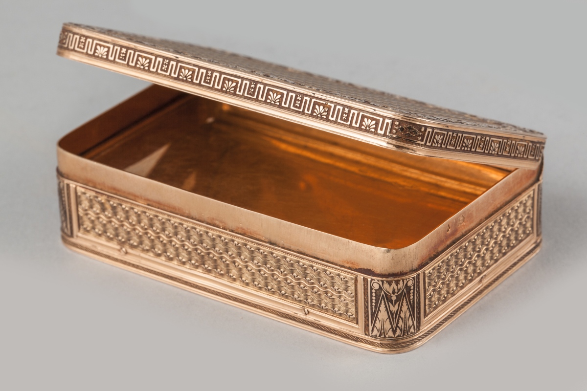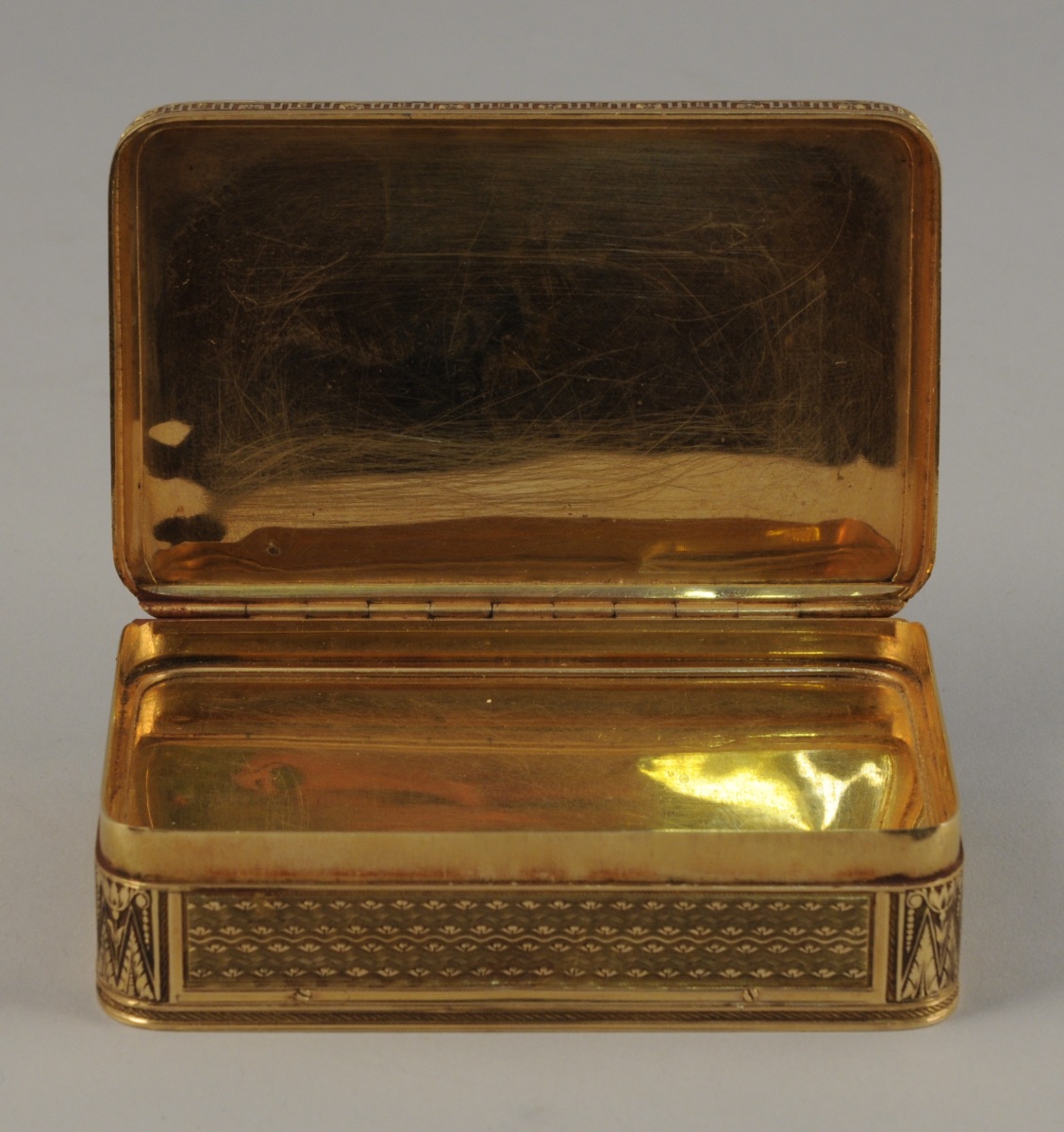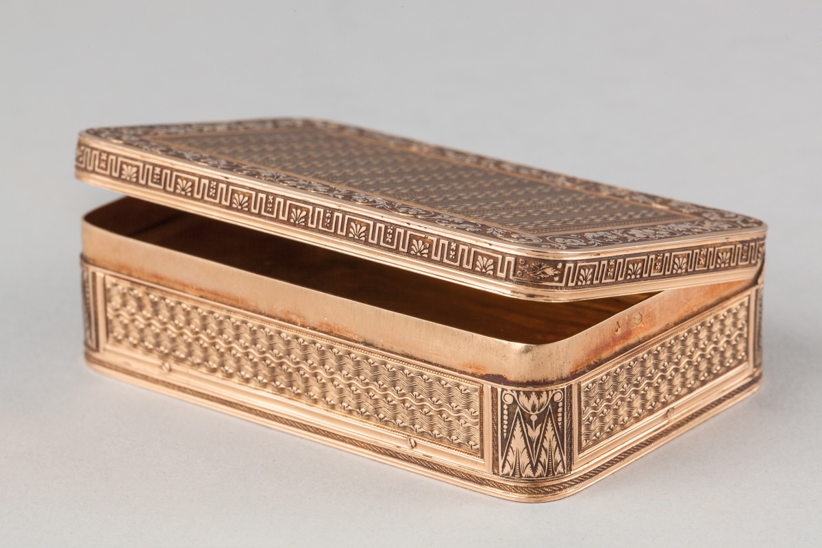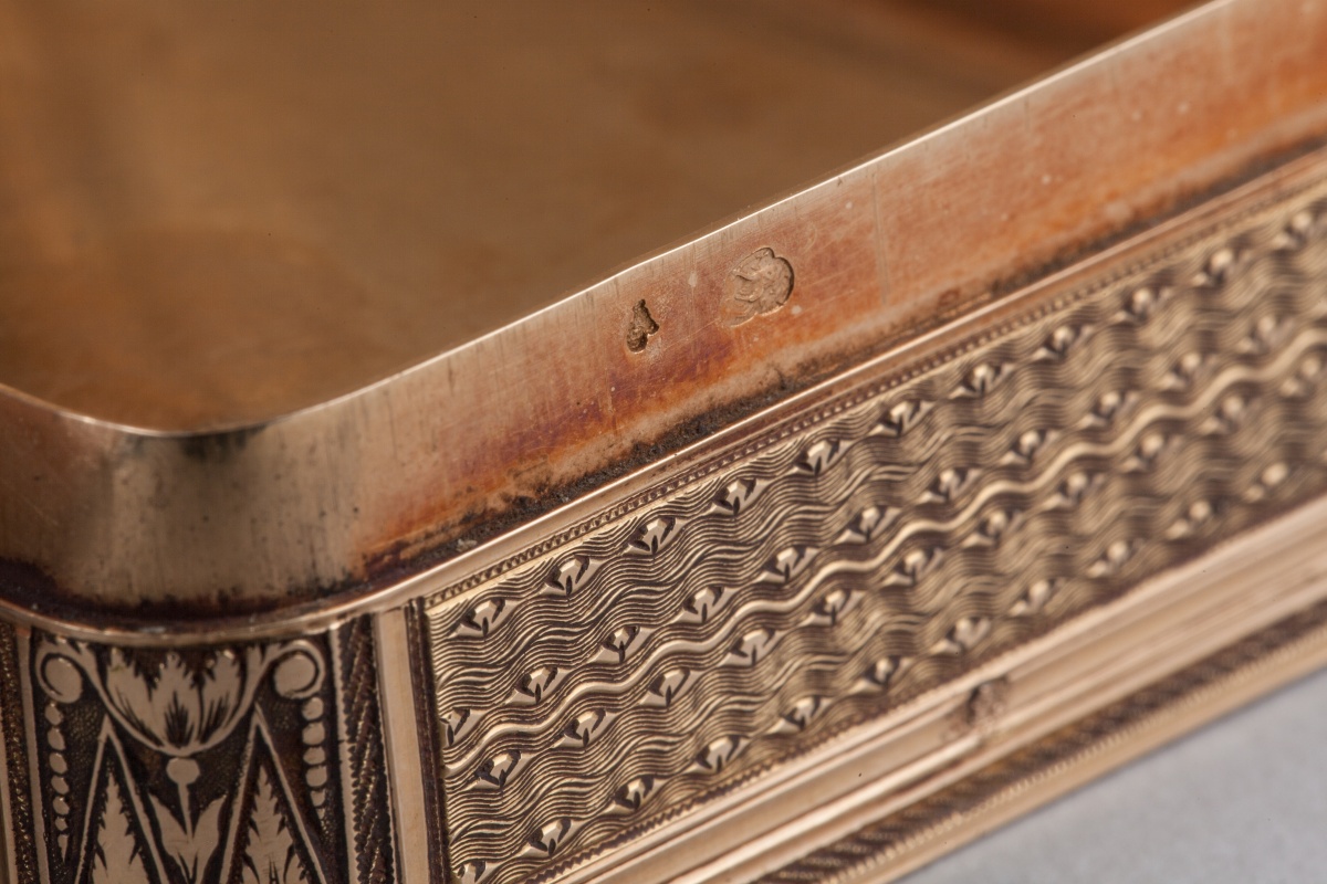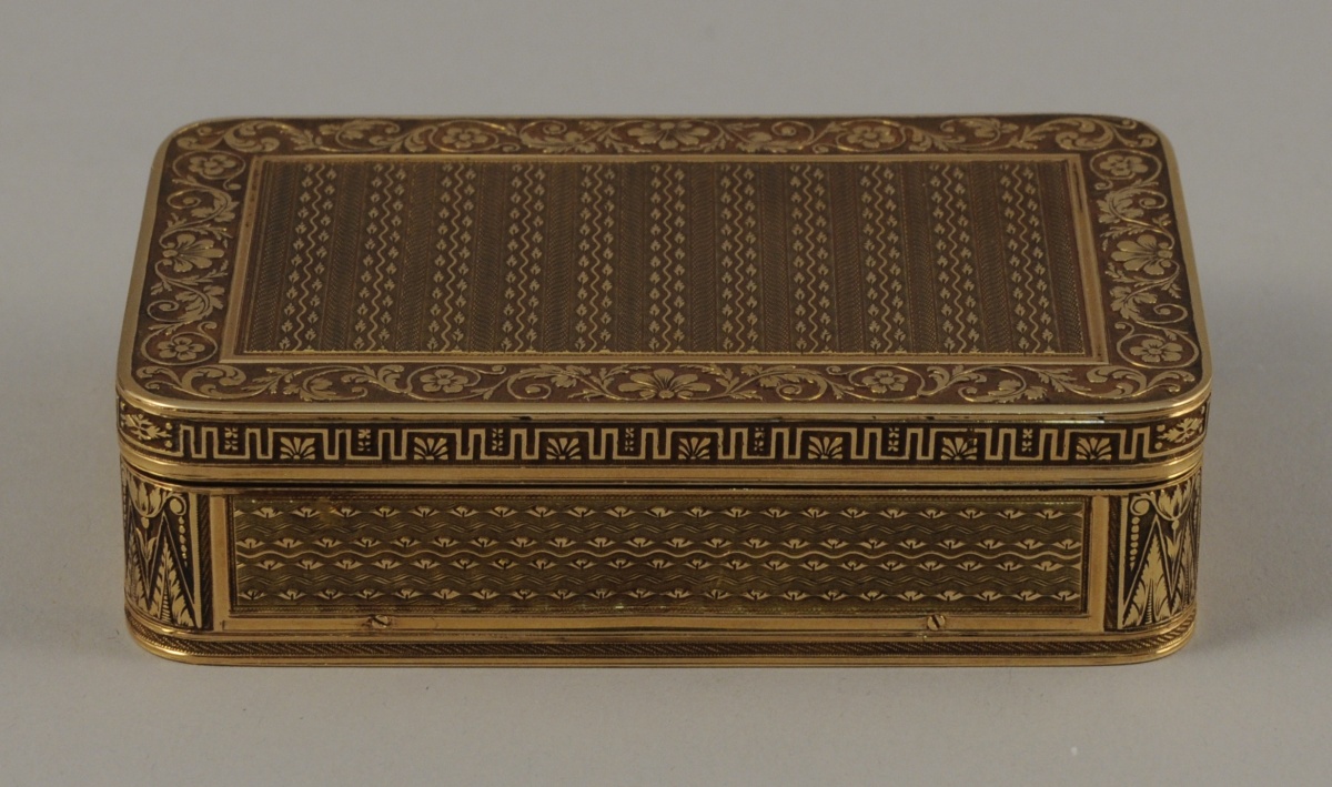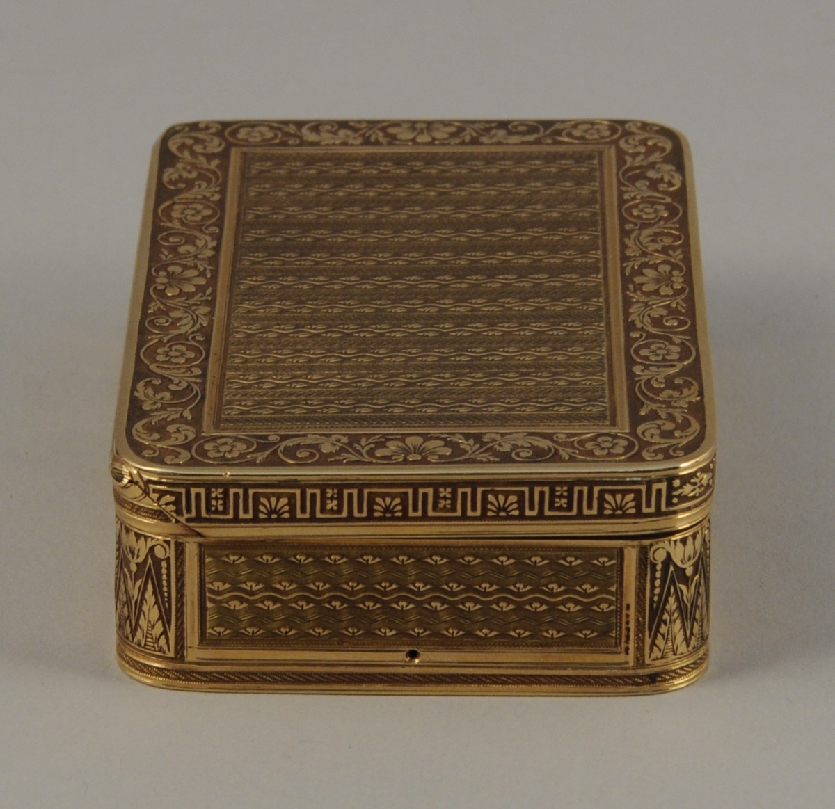 BOÎTE à MUSIQUE en or de deux tons rose et jaune, toutes faces. Précieux décor de guirlandes