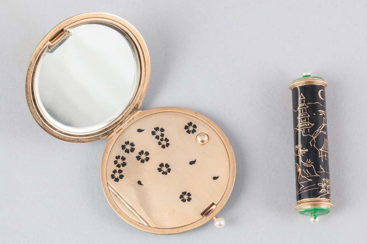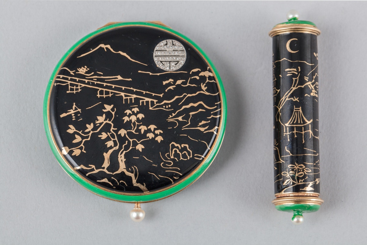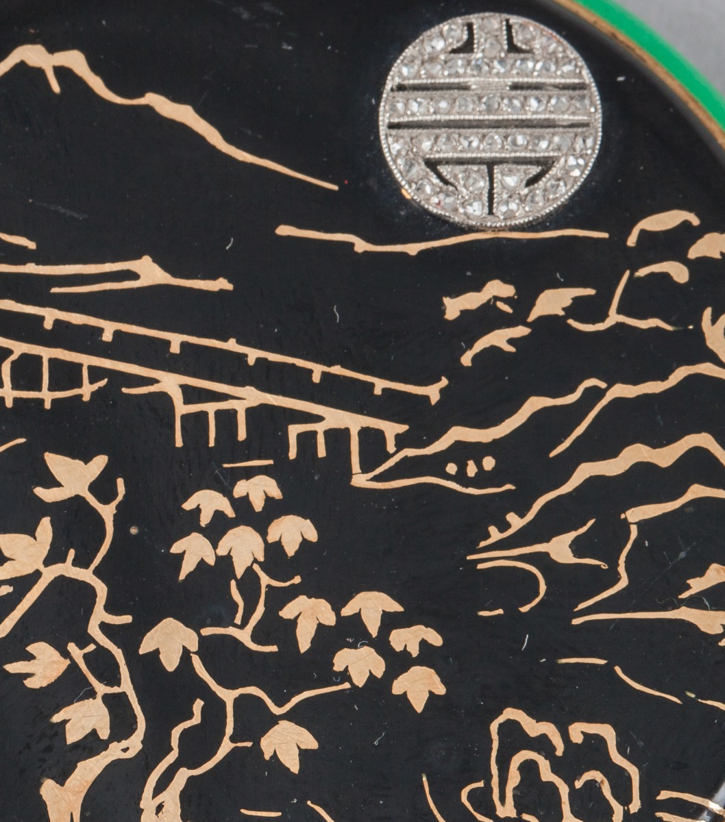 POUDRIER en or jaune de forme circulaire, ouvrant sur un compartiment à poudre orné de neuf fleurs, le revers sertid'unmiroir. La boîte à décor japonisant d'un paysage en laque noir et or dans un entourage émaillé vert, illuminé d'un "soleil" chinois en diamants taillés en rose. Fermoir orné d'une perle.