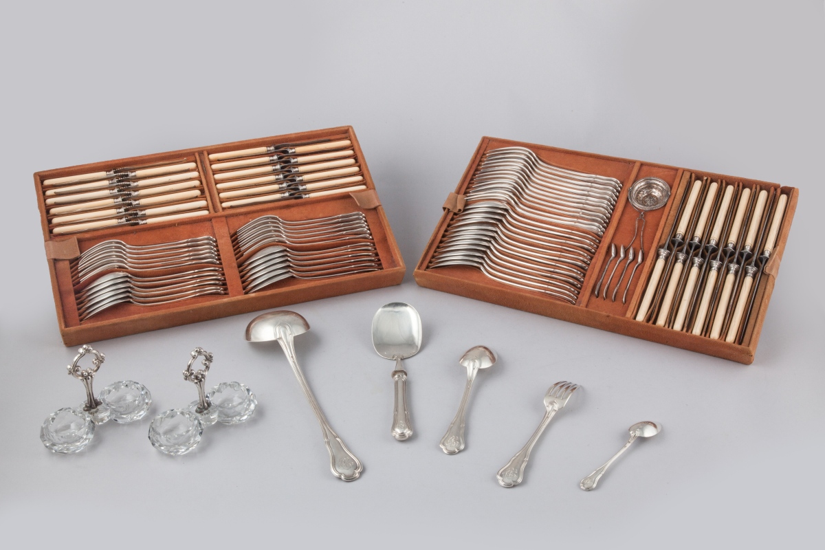 MÉNAGÈRE en argent de 137 pièces, modèle filets contour comprenant : 22 couverts de table, cuillères et fourchettes ; 12 couteaux, lame acier, manche ivoire ; 12 couverts à desserts, cuillères et fourchettes ; 12 petits couteaux, lame acier, manche ivoire ; 12 couteaux à fruit, lame argent, manche ivoire ; 12 cuillères à café ; quatre pelles à sel ; un passe-thé ; une pince à sucre ; une saupoudreuse;