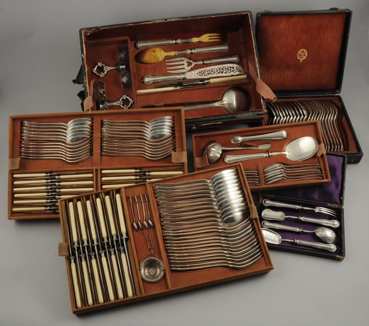 Dans trois coffrets accidentés. (usures, lames en acier oxydées, l'une brisée et certains manches en ivoire fendus)