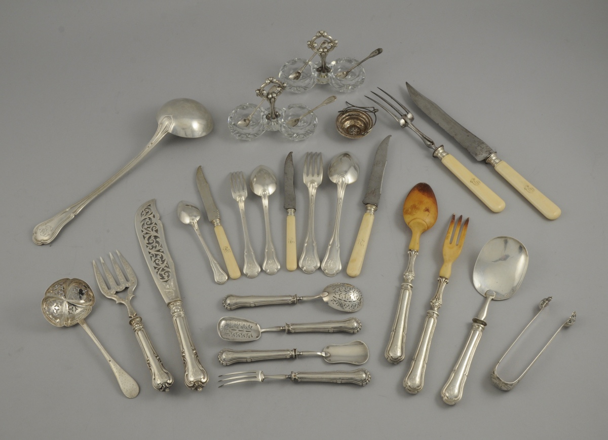 une pelle à glace ; une louche, un couvert à salade, le cuilleron et la fourche en ivoire ; une fourchette à gigot, fourche acier, manche ivoire ; un couteau à trancher, lame acier, manche ivoire ; une fourchette et un couteau de service à poisson ; un service à hors d'oeuvre comprenant une fourchette à trois dents, une pelle à thon, une cuillère à olives et une pelle à beurre ; une paire de salières, les salerons en cristal taillé, la prise à décor d'agrafes en métal argenté.