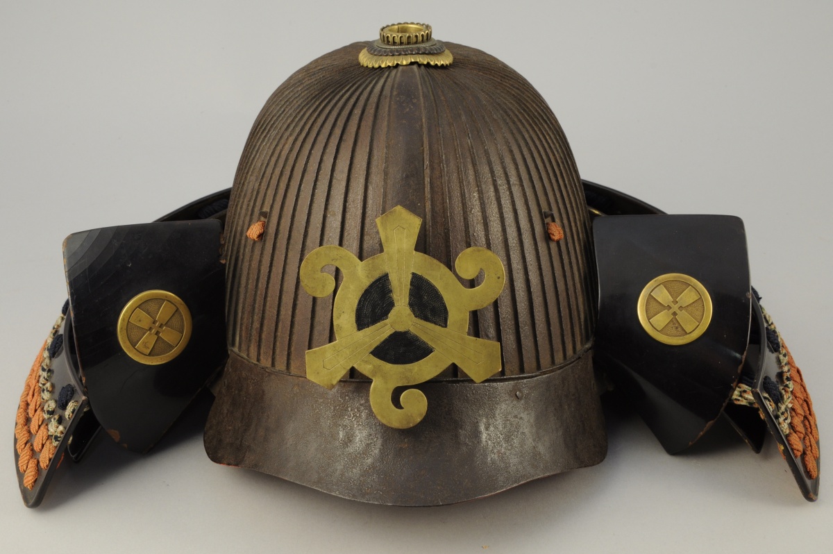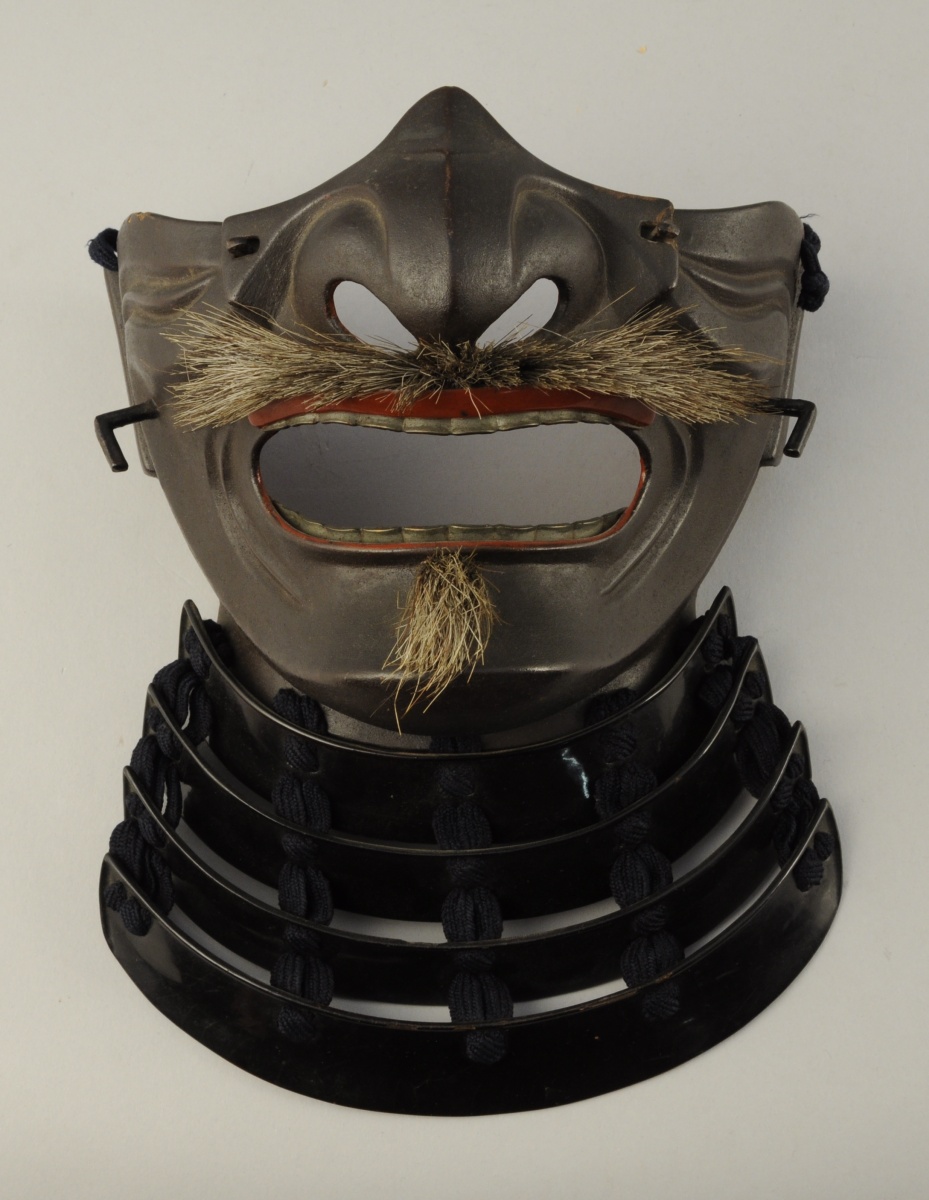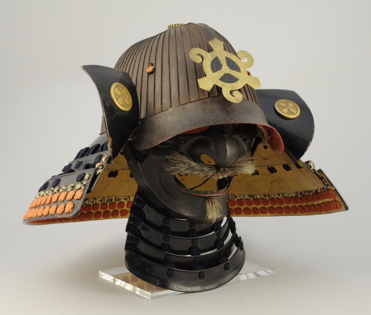 • Casque Suji bachi à 62 lamelles en fer, école de Saotome, omanju shikoro, les fukigaeshi orné de môn de deux pilons dans un double cercle, maedate à décor de trois ken dans un cercle. Demi-masque du type ressei-men en fer.