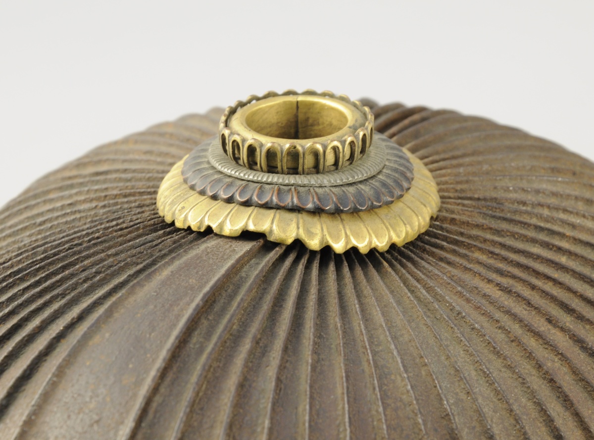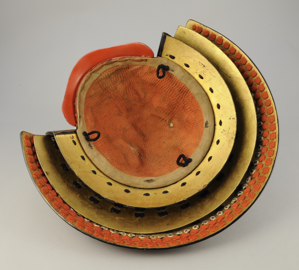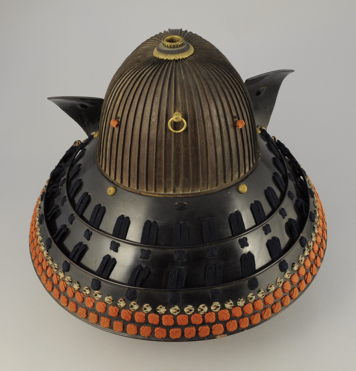 • Casque Suji bachi à 62 lamelles en fer, école de Saotome, omanju shikoro, les fukigaeshi orné de môn de deux pilons dans un double cercle, maedate à décor de trois ken dans un cercle. Demi-masque du type ressei-men en fer.