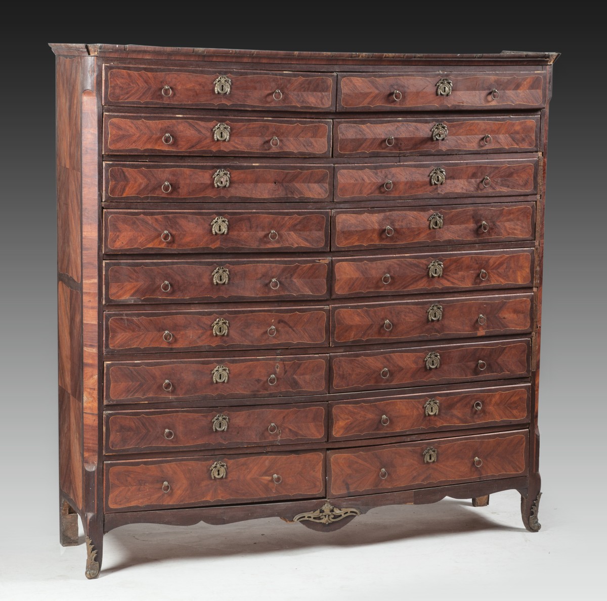 Rare meuble CABINET de TRAVAIL, à deux rangs de neuf tiroirs, en bois de placage et marqueterie en point de Hongrie. Piètement galbé, ornementation de bronzes dorés.