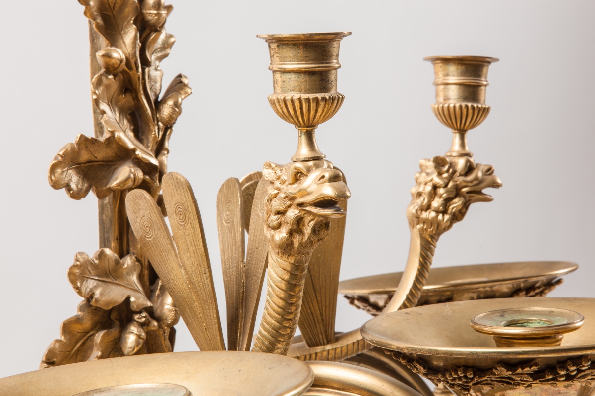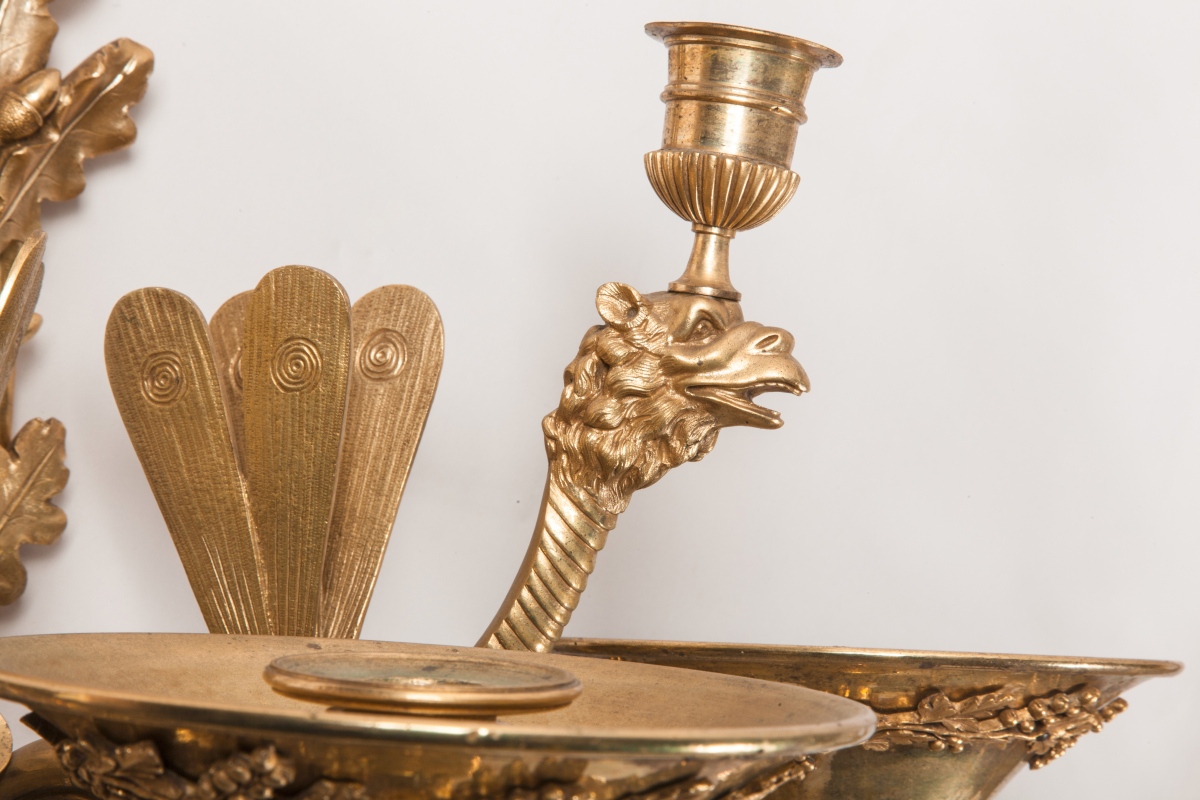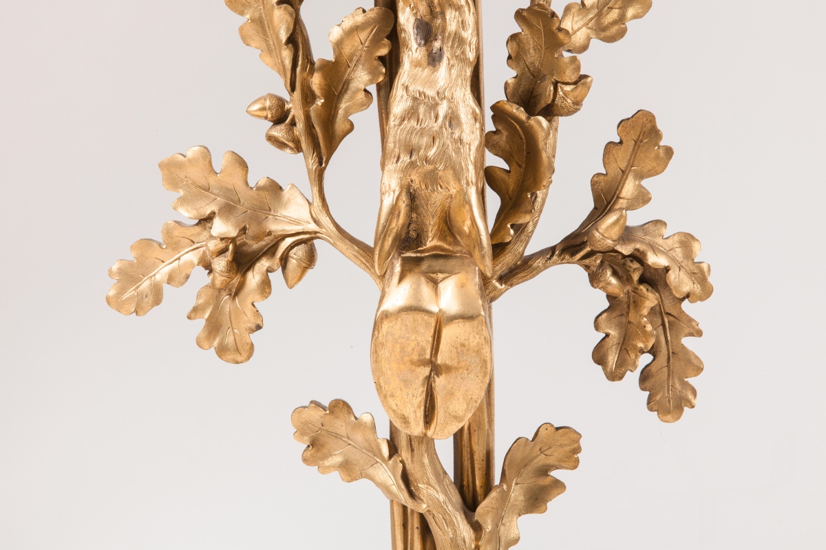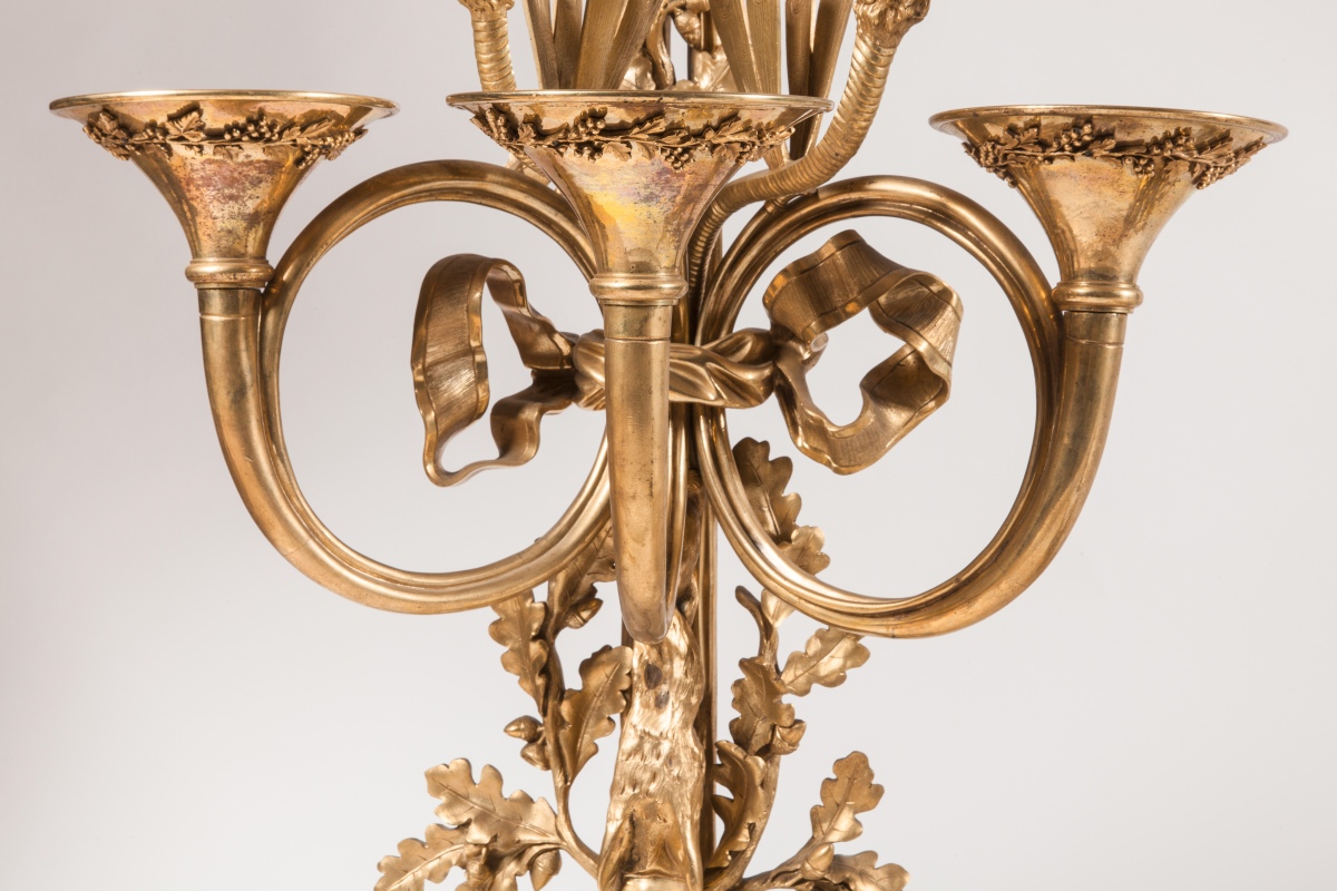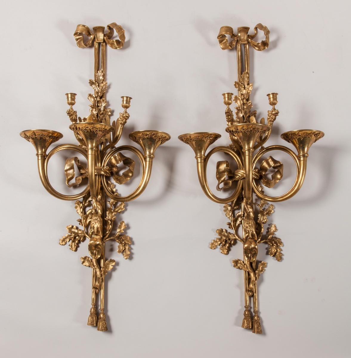 Le modèle d'appliques aux cors de chasse est très en vogue à la fin du XVIIIe siècle. On le trouve sous diverses variantes dans les plus grandes collections, comme celles de la reine Marie-Antoinette, à Bagatelle, ou encore au Palais Pavlosk à Saint-Pétersbourg. Son succès ne se dément pas sous l'Empire. En témoignent ces quatre "bras à cors de chasse" livrés par Claude Gallé le 23 décembre 1809 pour le Salon de Petite Compagnie au Petit Trianon, pour la somme de 2.960 francs. Notre modèle est la réplique de ces appliques de Trianon, à ceci près que le putto, dans la partie supérieure du fût, est remplacé par des feuilles de chêne. Notre paire a probablement été réalisée au milieu du XIXe, par la maison Beurdeley, une des plus importantes dynasties de fabricants de meubles active à Paris entre 1818 et 1895.