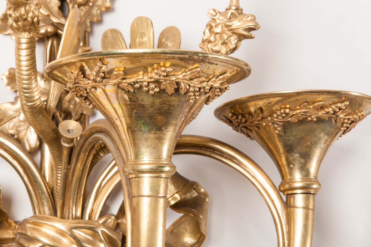 Grande PAIRE d'APPLIQUES AUX CORS DE CHASSE ET CHIMÈRES en bronze doré. Trois bras de lumière aux cors de chasse réunis par un ruban surmonté de deux bras de lumière aux chimères à
