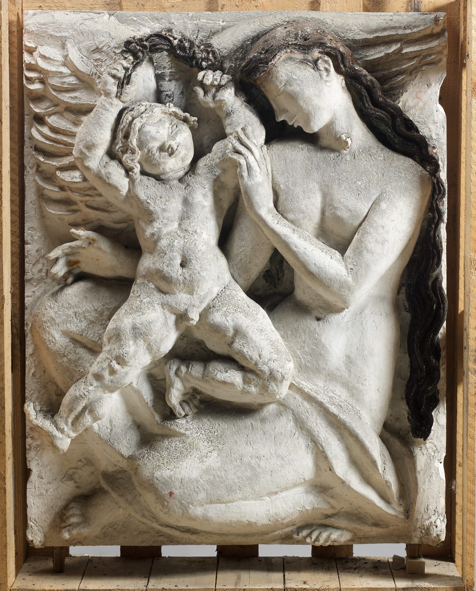 Plâtre original, haut-relief. Cheveux polychromes, renforts de bois.