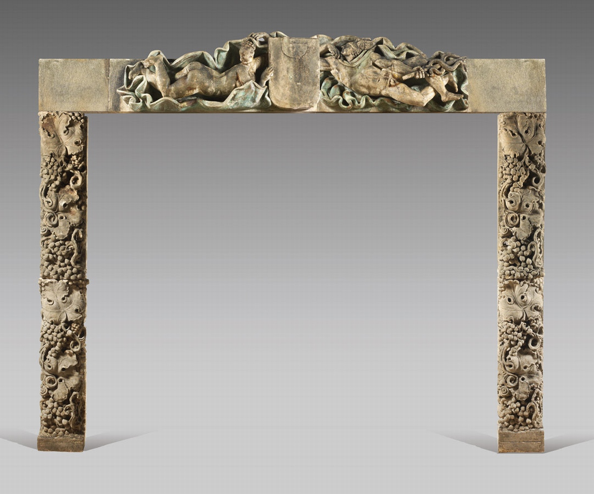 Cadran solaire entouré par Vénus et Mercure, sur un entablement porté par deux colonnes de vignes et motifs de pampres.