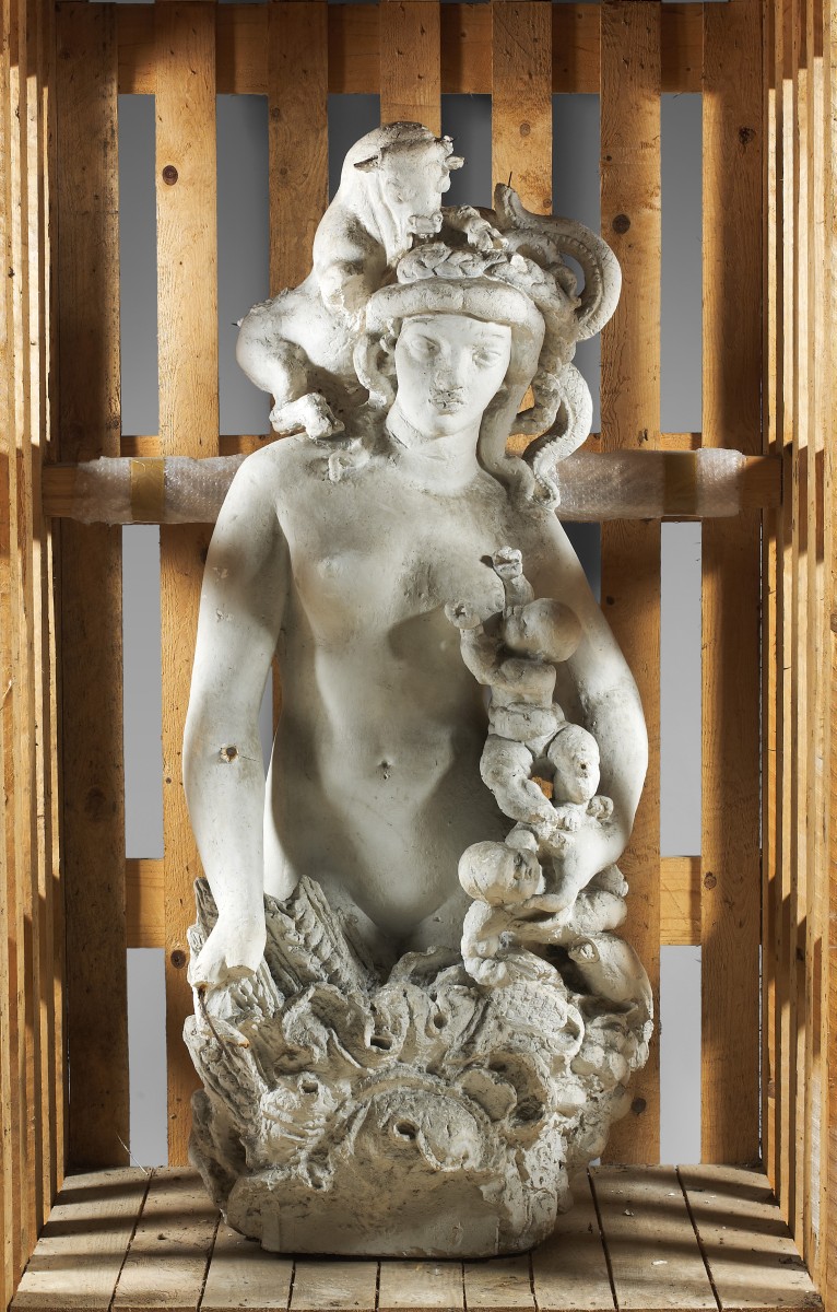 Haut. 167, Larg. 70, Prof. 63 cm. (Manque les cornes, deux pattes et la queue du taureau, deux doigts de la main droite, le pouce de la main gauche, un pied et une main des putti, tête du serpent accidentée).