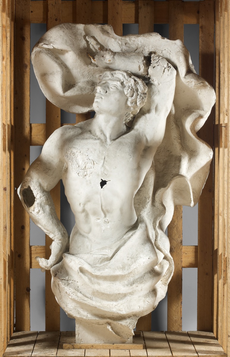 Haut. 200, Larg. 125, Prof. 61 cm. (Accidents, éclats et manques : nez, doigts de la main gauche, avant-bras gauche, avant-bras droit, pouce droit, torse, ventre et sur le manteau).