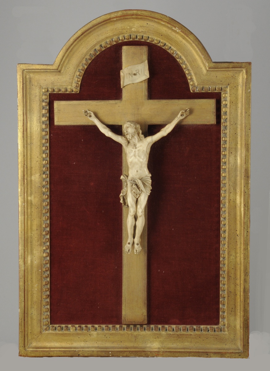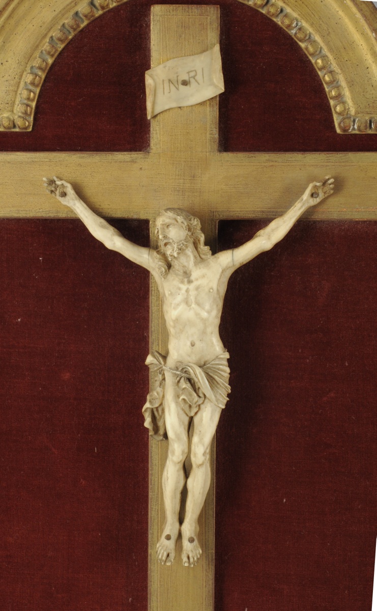 CRUCIFIX. Le Christ et le phylactère en ivoire sur Croix en bois doré. Cadre en bois mouluré, sculpté et doré à motifs de raies de perles. Travail ancien. Haut. du Christ : 17 cm. Dim. hors tout : 40 x 27 cm. (petits manques)