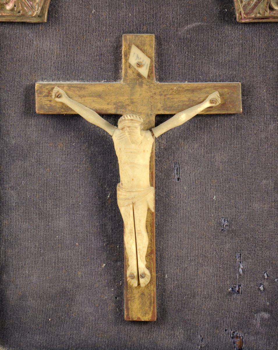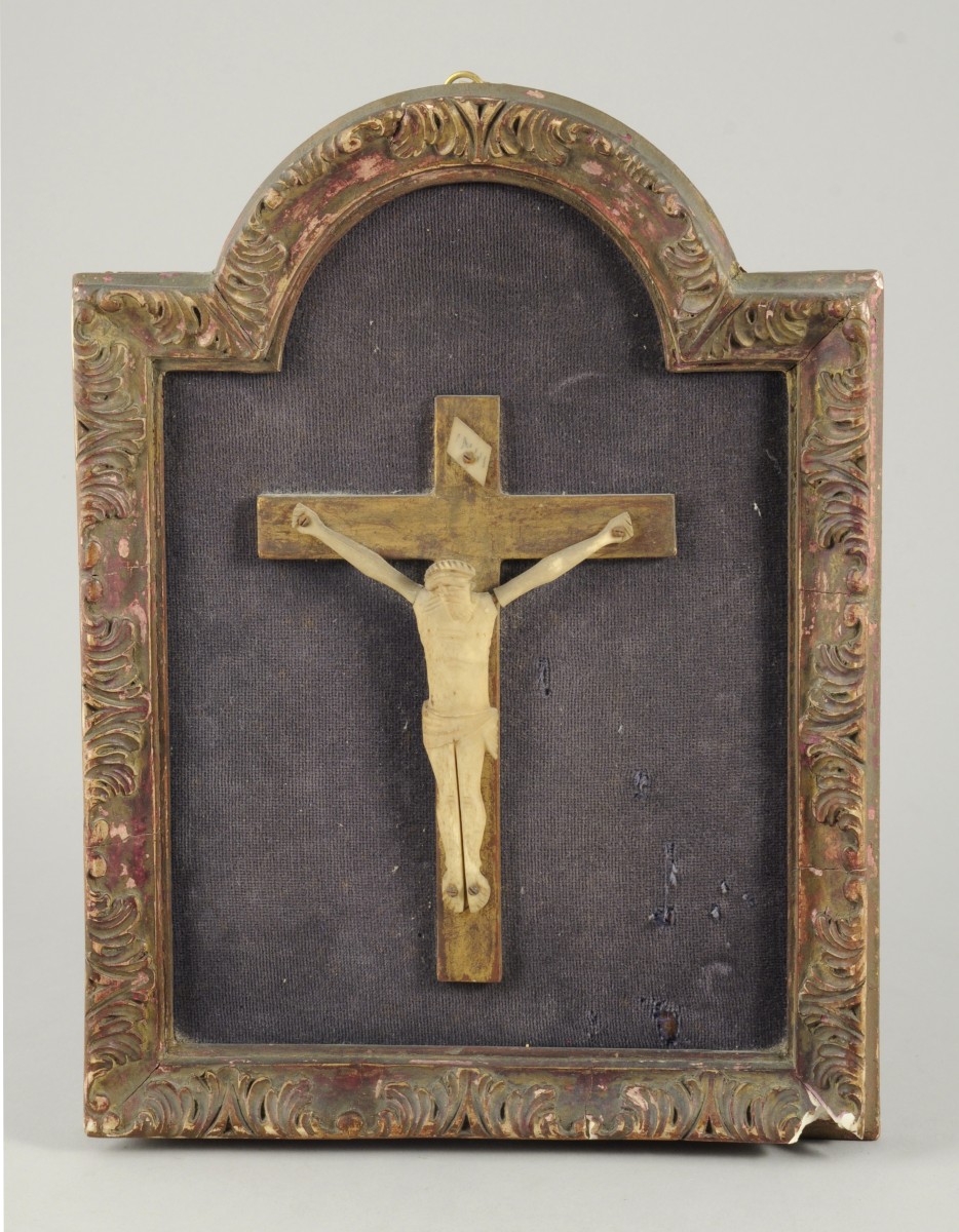 CRUCIFIX en os sculpté. Le Christ à la tête inclinée, perizonium noué à droite. Phylactère marqué "INRI". Croix en bois doré. Dans un cadre en bois sculpté de feuilles d'acanthe. Haut. du Christ 11, Haut. du cadre 29, Larg. 22 cm. (manques au cadre)