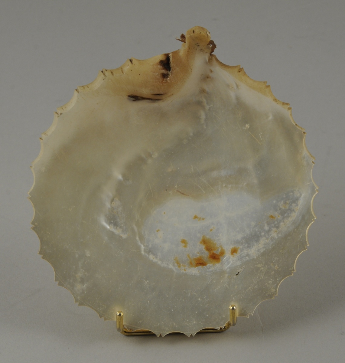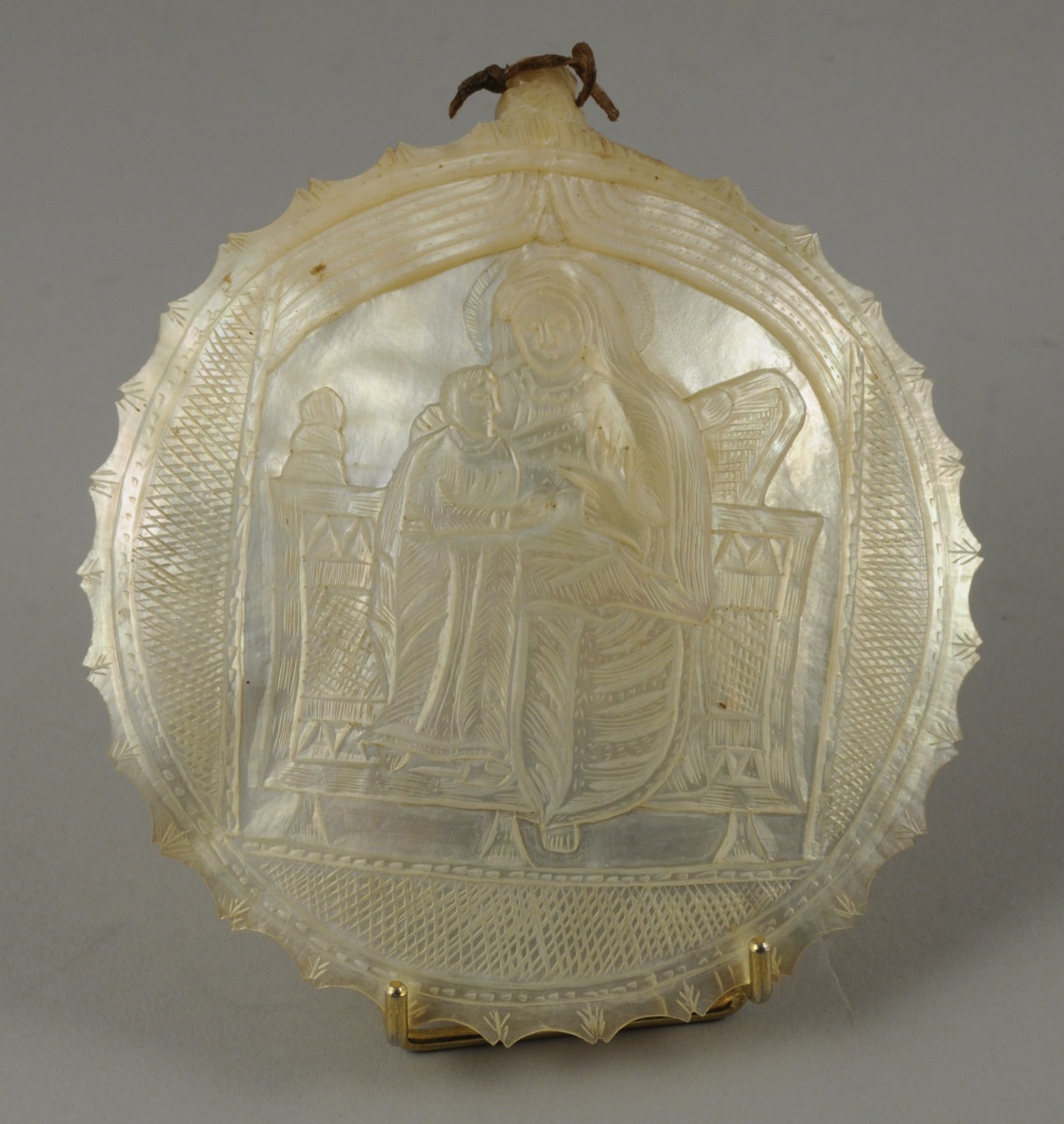 SAINTE-ANNE ET LA VIERGE. Nacre sculptée représentant Sainte Anne, assise, apprenant à lire à sa fille, la Vierge Marie. Encadrements ornés de croisillons. Contours dentelés.
