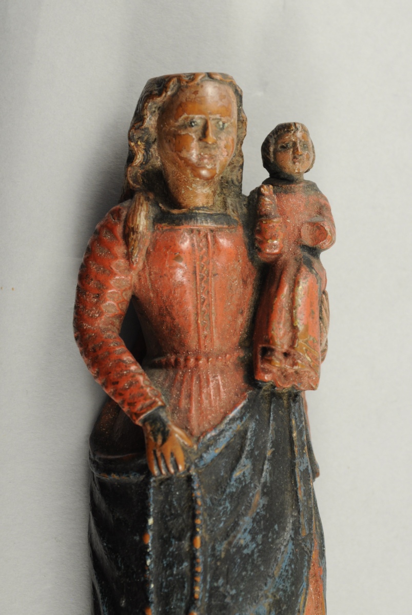 VIERGE à L'ENFANT. Bois sculpté polychrome. Tient un chapelet dans sa main droite. Sculpture à caractère populaire dans le goût du Haut Moyen Âge, probablement XVIIIème siècle. Étiquette sous la base : "Fin du XIVème siècle". Hauteur : 17,6 cm (petits manques et accidents)