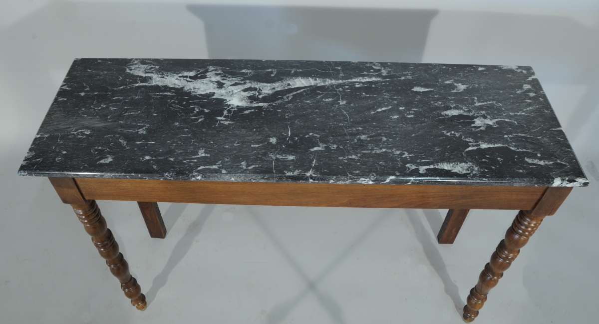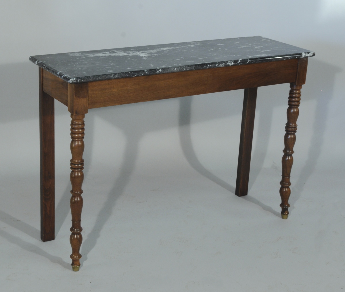 CONSOLE en bois naturel. Pieds antérieurs tournés en balustre, pieds postérieurs droits. Dessus de marbre noir veiné blanc.