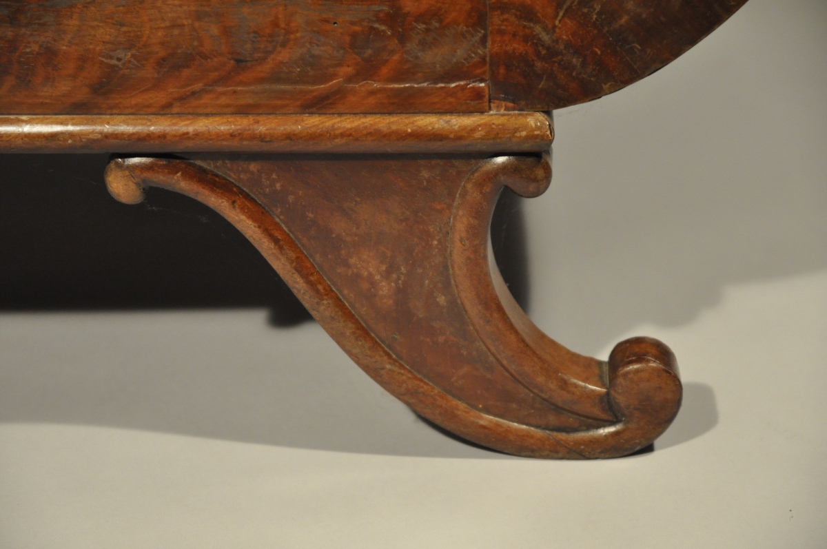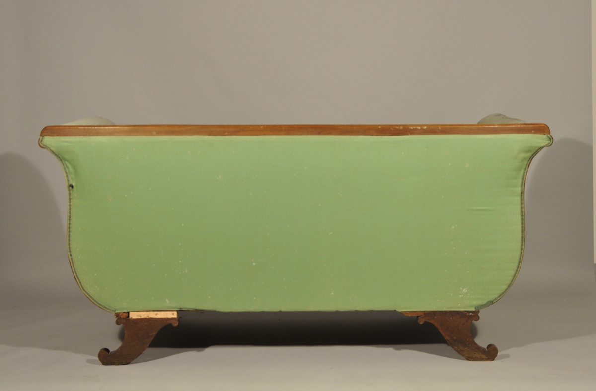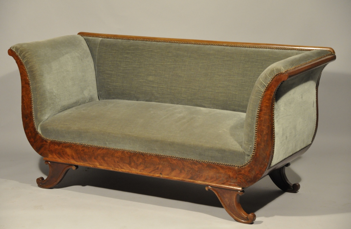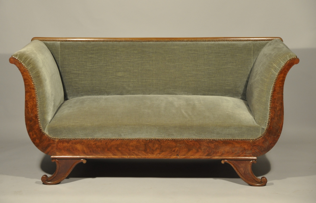CANAPÉ en acajou et placage d'acajou mouluré. Accotoirs renversés. il repose sur quatre pieds cambrés terminés en volute.