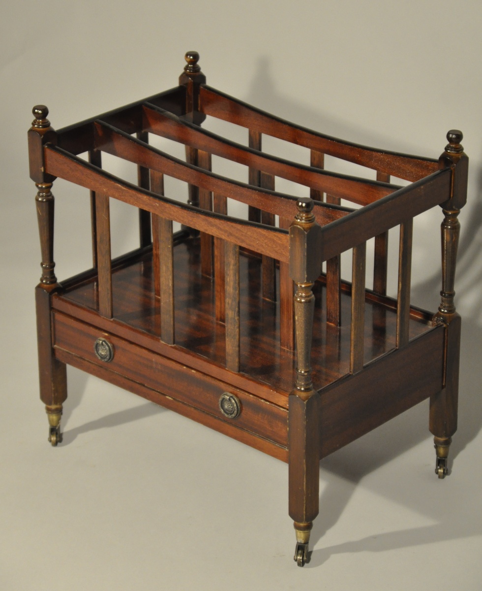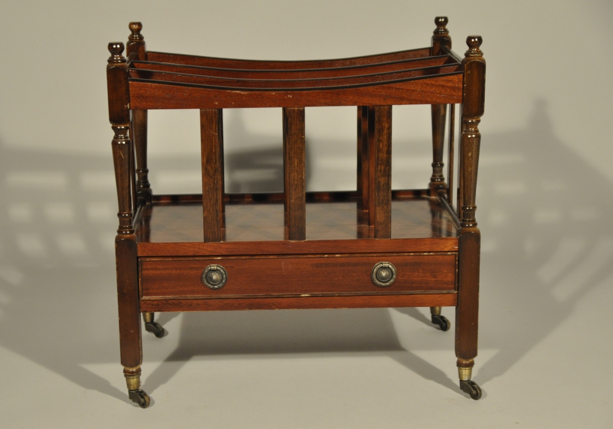 PORTE-REVUES à barreaux en hêtre mouluré et teinté. Il ouvre à un tiroir en ceinture. Montants tournés en balustre. Anneaux de tirage et sabot en laiton. Monté sur roulettes.