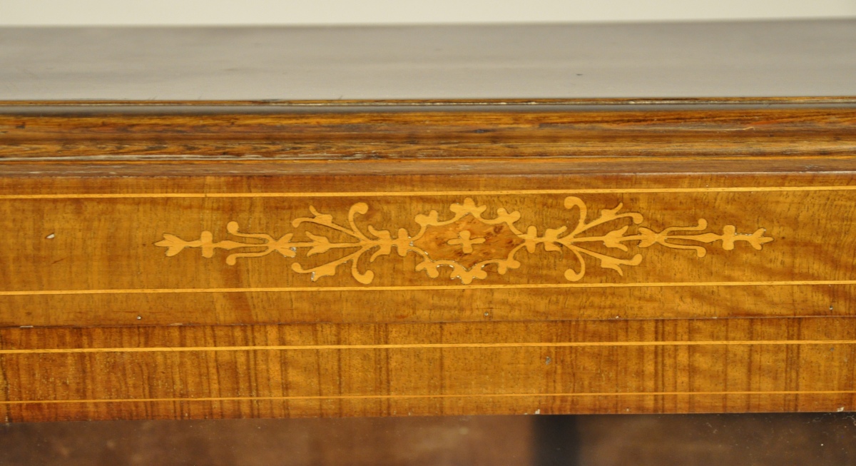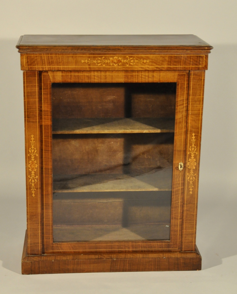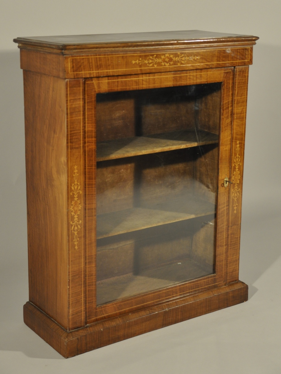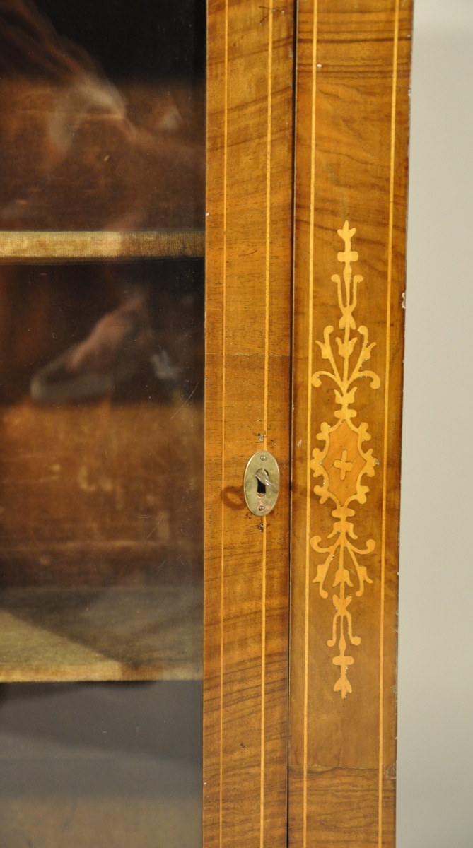 VITRINE en bois exotique mouluré et teinté. Elle ouvre à un vantail vitré découvrant trois compartiments. Décor marqueté de bois clair de rinceaux feuillagés et filets.