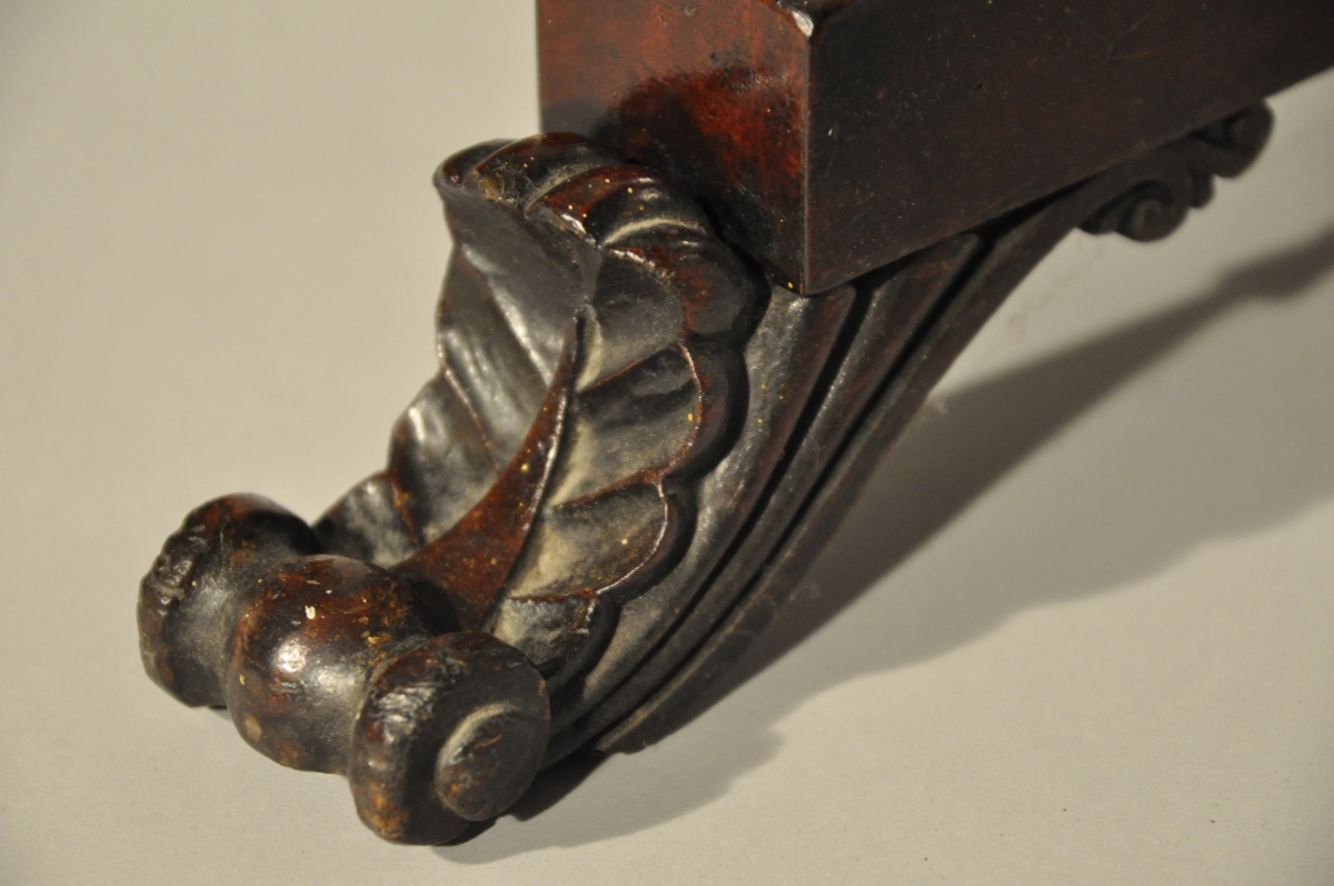 PETIT BUREAU en acajou et placage d'acajou mouluré et sculpté. Il ouvre à un tiroir en ceinture. Un faux tiroir. Plateau orné de clefs tombantes. Pieds terminés en enroulements réunis par une entretoise tournée en balustre.