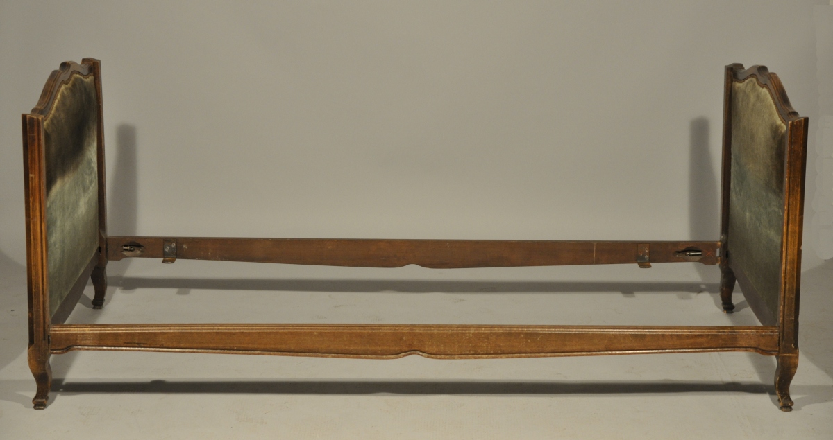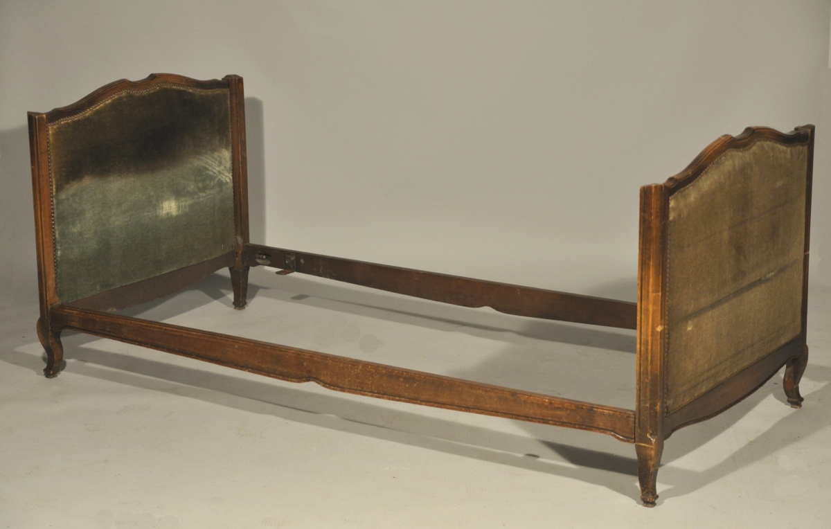 BOIS de LIT simple en hêtre mouluré et teinté. Chevet et pied à traverse supérieure chantournée et garnis de velours vert.