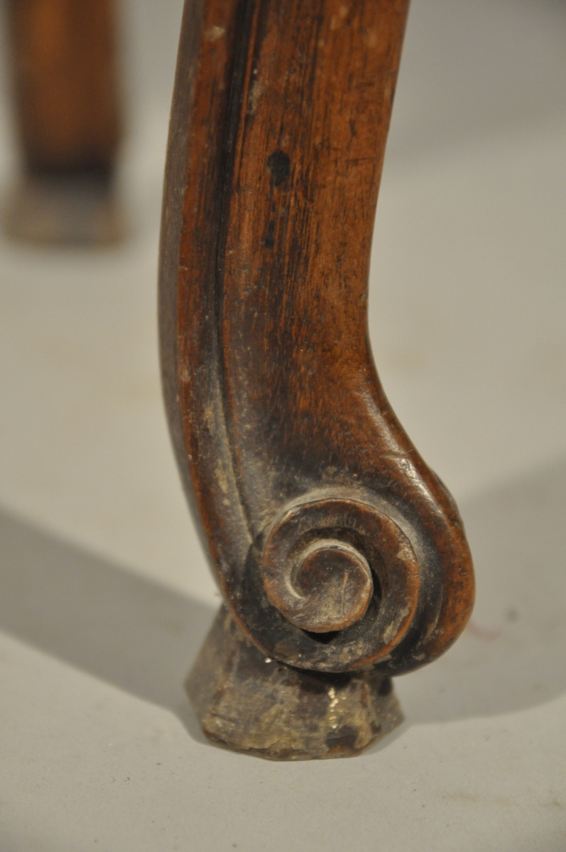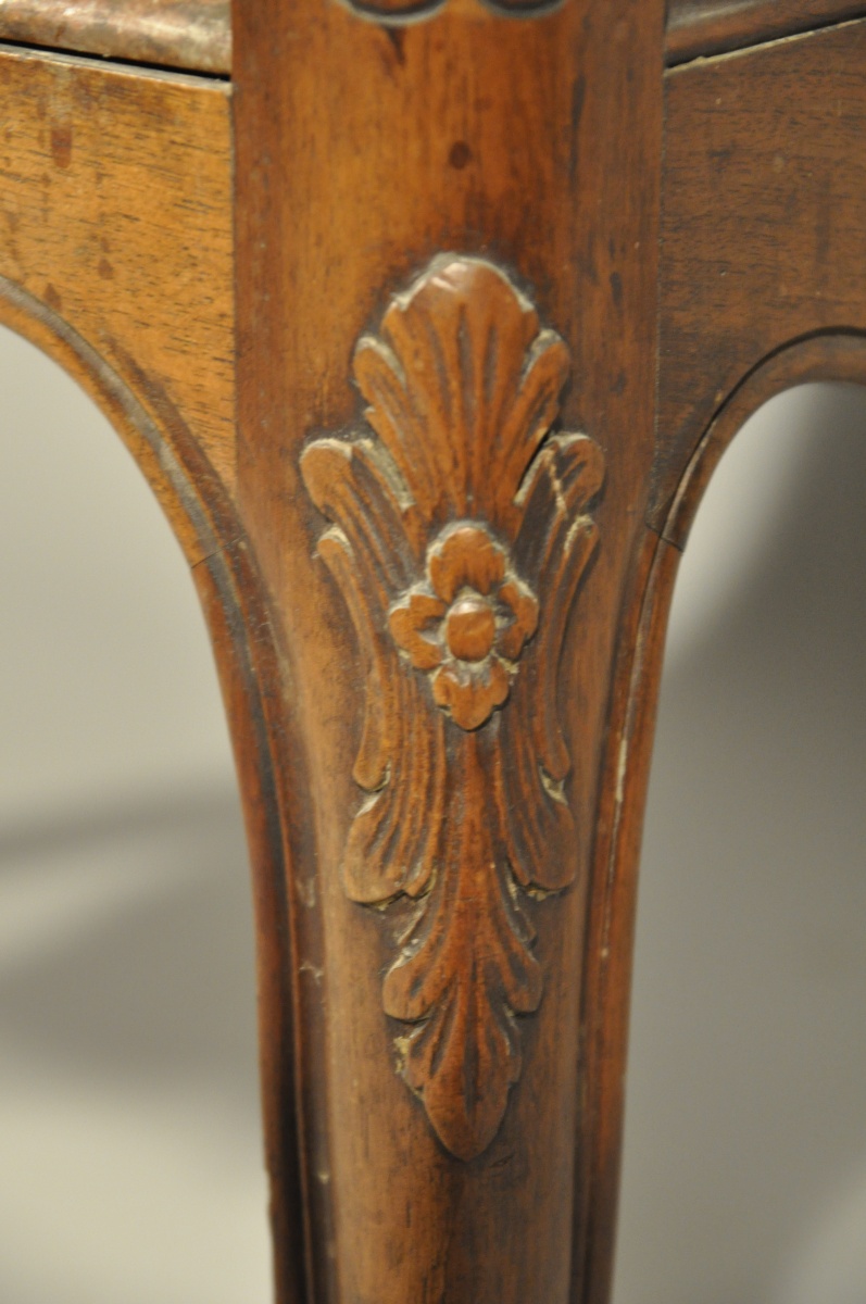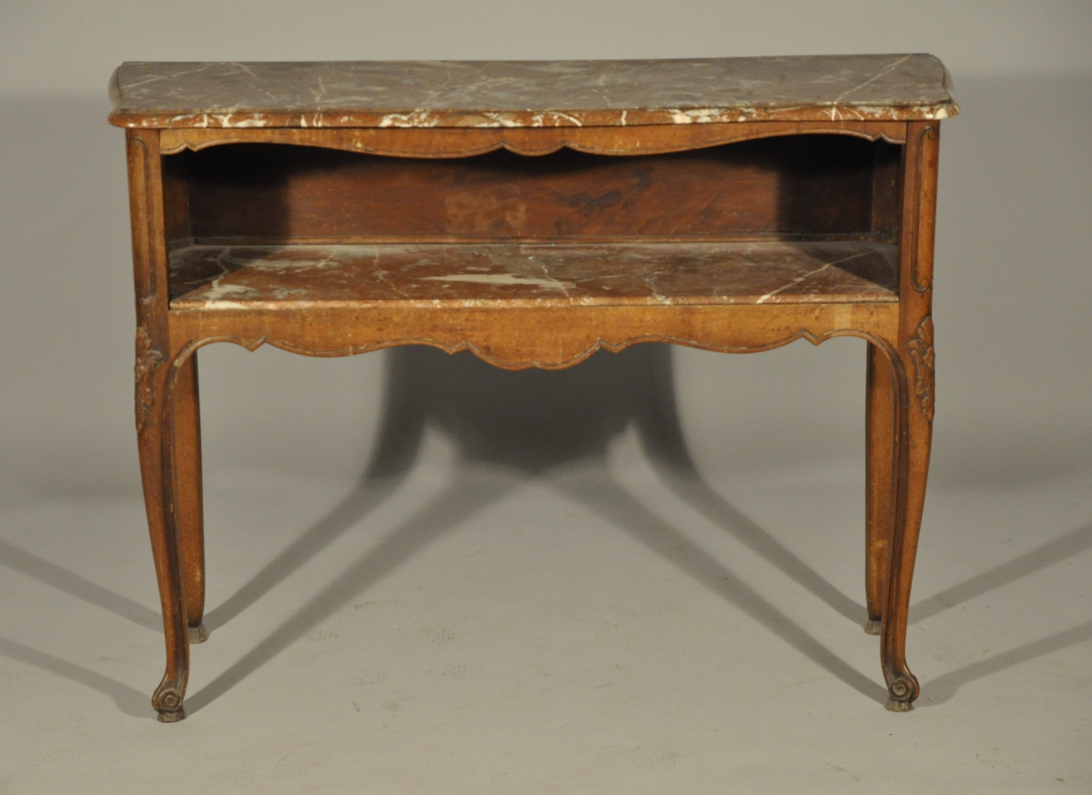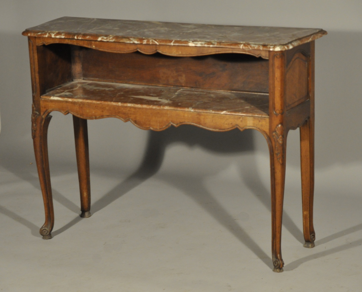 CONSOLE DESSERTE en hêtre mouluré, sculpté et teinté. Il repose sur quatre pieds cambrés terminés en volute. Les montants antérieurs sculptés d'une feuille d'acanthe stylisée et d'une fleurette. Traverse chantournée soutenant une tablette en marbre rouge veiné blanc. Dessus de marbre chantourné rouge veiné blanc.