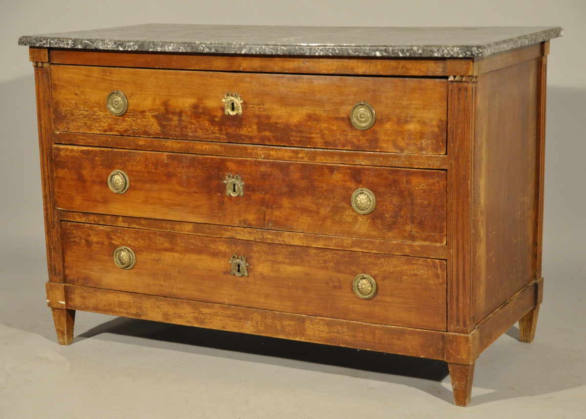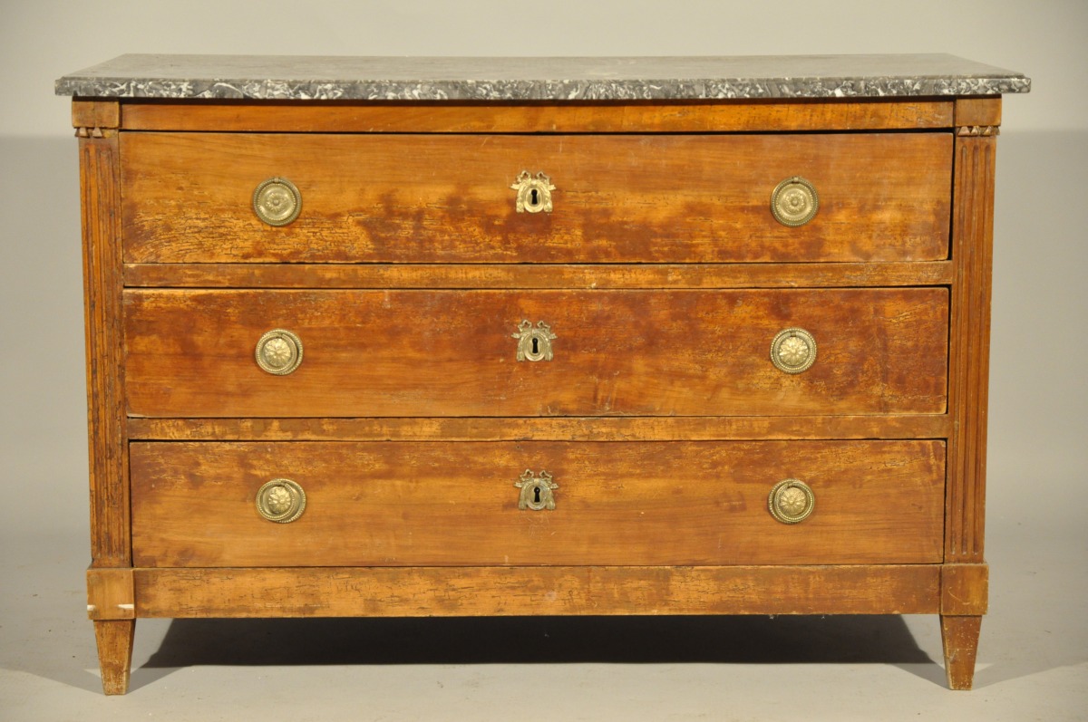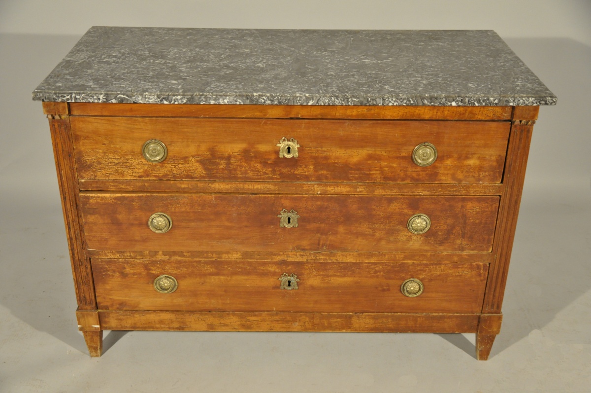 COMMODE en noyer mouluré et sculpté ouvrant en façade par trois tiroirs. Montants antérieurs cannelés et ornés de triglyphes. Montants postérieurs cannelés. Pieds en gaine. Dessus de marbre gris veiné blanc.