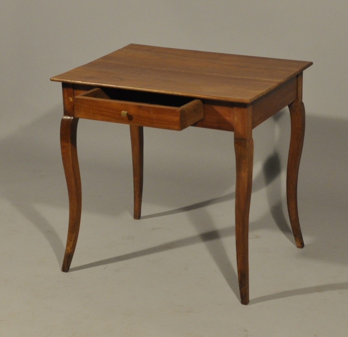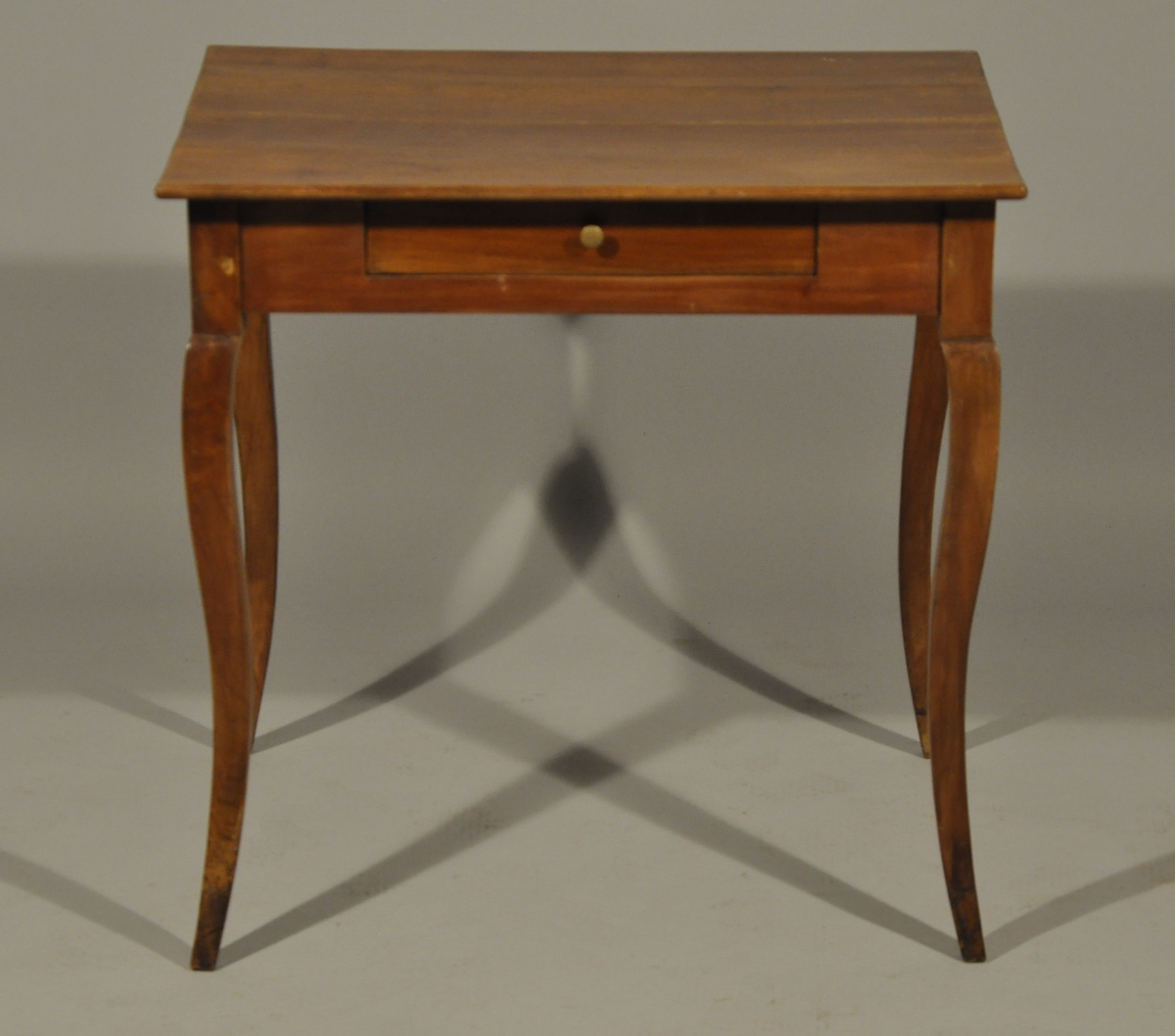 TABLE en noyer mouluré ouvrant en façade par un tiroir. Elle repose sur quatre pieds cambrés.