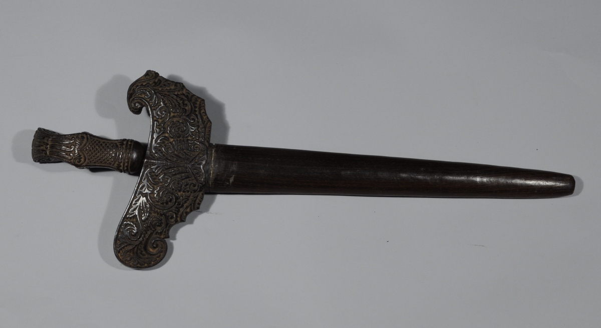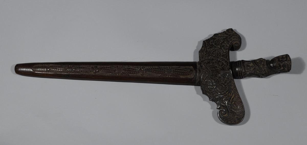 KRISS MALAIS. Poignée à décor d'une divinité et poignée en bois sculpté. Lame droite en acier pamor.