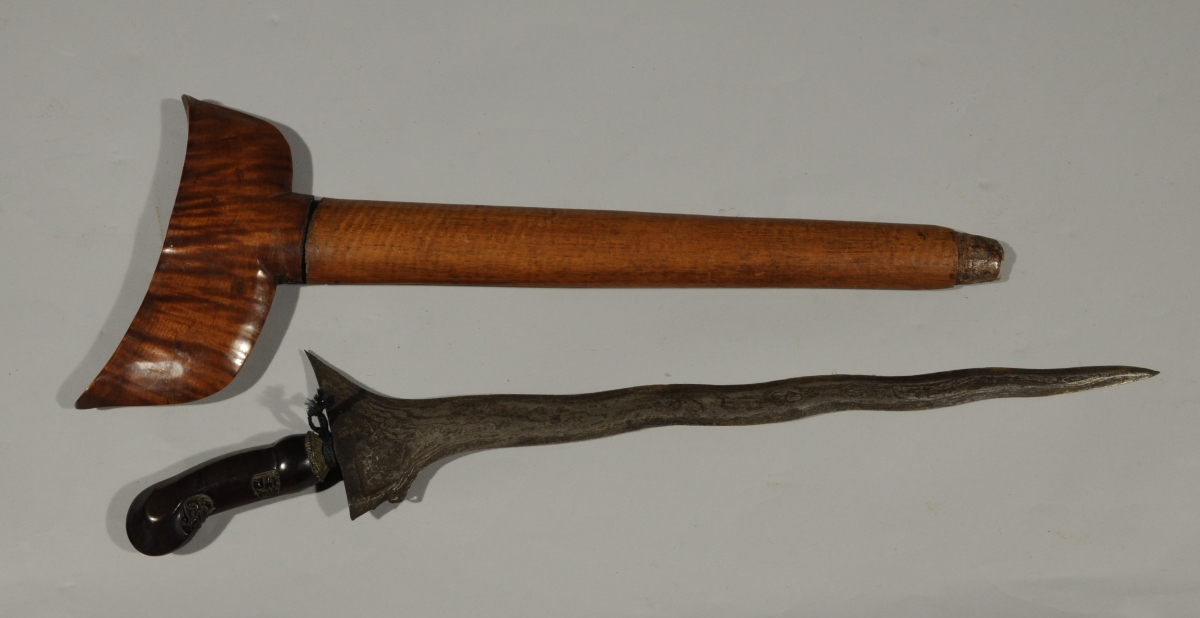 KRISS MALAIS. Poignée sculptée. Lame flamboyante en acier pamor. Fourreau en bois clair.
