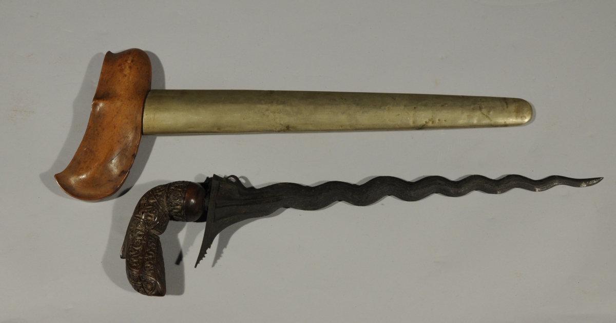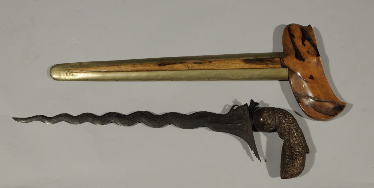 KRISS MALAIS. Poignée sculptée d'une divinité stylisée. Lame flamboyante en acier pamor. Fourreau en bois clair recouvert en partie de laiton.
