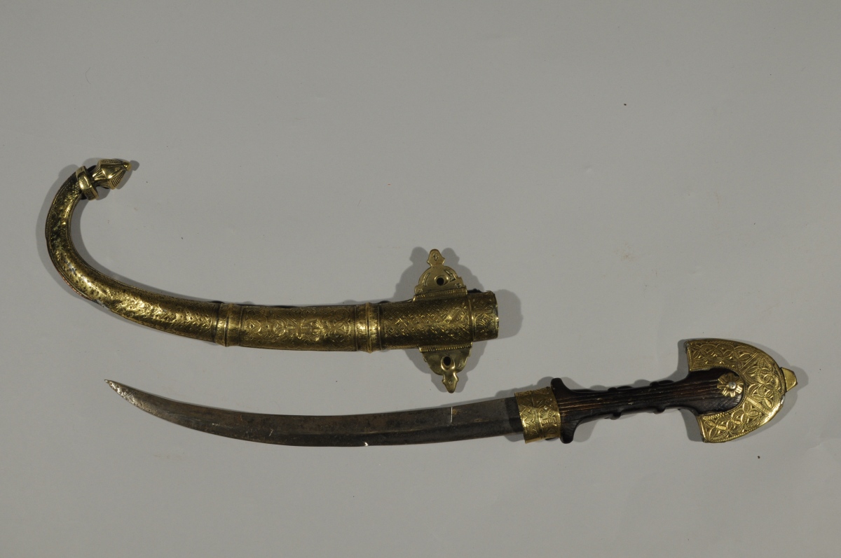 Poignée en bois. Monture en laiton ciselé et gravé. Lame courbe à arête médiane.