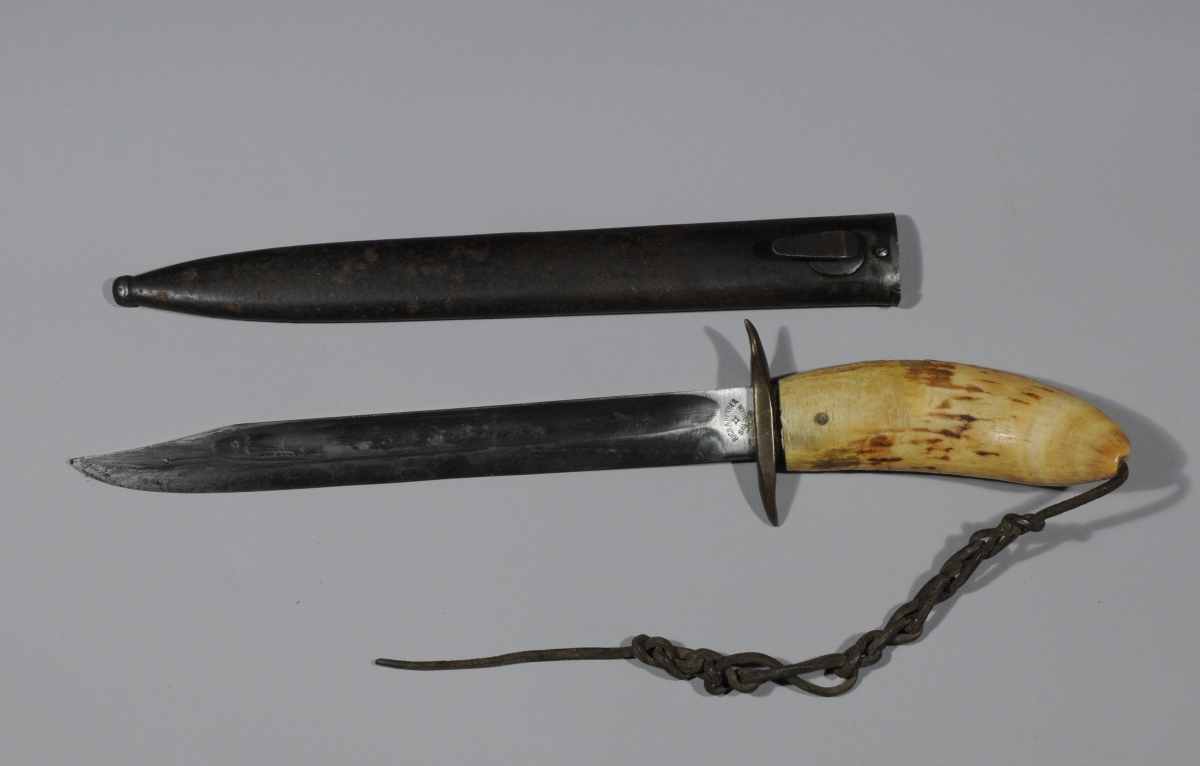 COUTEAU DE CHASSE. Poignée en dent de phacochère. Lame droite à pans creux et contre tranchant. Fourreau en tôle de fer de baïonnette. La lame marquée "RICH. A. HERDER / SOLINGEN".