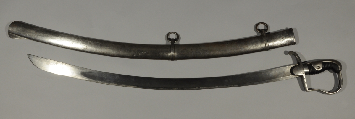 Poignée en bois. Monture en fer, garde à la Blücher à deux demi oreillons, dont un matriculé. Large lame courbe à dos plat marqué au talon " 1831 " et pans creux. Fourreau en tôle de fer à deux bracelets et deux anneaux.