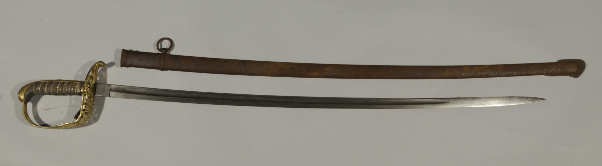 Poignée recouvert de galuchat avec filigrane. Monture en laiton, garde à une large branche ajourée et gravée de rinceaux feuillagées. Lame cintrée à pans creux gravée de rinceaux feuillagés et trophées d'armes. Fourreau en tôle de fer à un bracelet (oxydations).