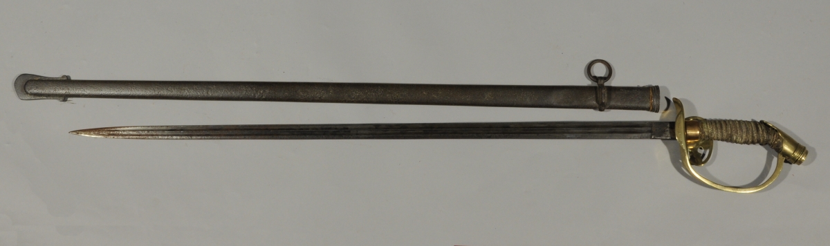 Poignée en basane avec filigrane (manque). Monture en laiton, garde à une branche et coquille rabattable ciselée de l'Aigle et du monogramme de Wilhem II. Lame droite à double gouttière. Fourreau en tôle de fer à un bracelet (oxydation).