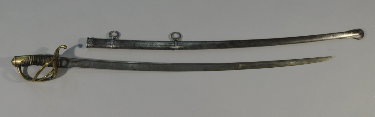 SABRE DE CAVALERIE LÉGÈRE troupe modèle 1816. Poignée recouverte de basane avec filigrane. Monture en laiton. Garde à trois branches à quillon courbe avec matricule. Lame courbe à dos rond et contre tranchant, poinçonnée au talon "L" pour Lobstein (Réviseur à Klingenthal) et signée "Manufre Rale de ? Aout 1819". Fourreau en tôle de fer à deux bracelets et deux anneaux.