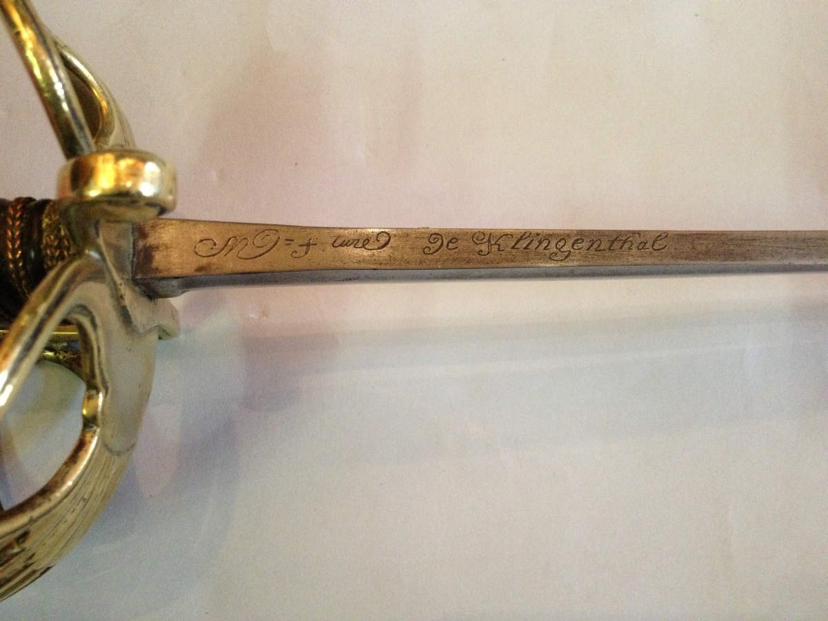 Poignée recouverte de basane avec filigrane. Monture en laiton, calotte à pans, garde à coquille ajourée (traces de poinçons). Lame cintrée à dos plat gravé " Mture de Klingenthal ", pans creux et contre tranchant.