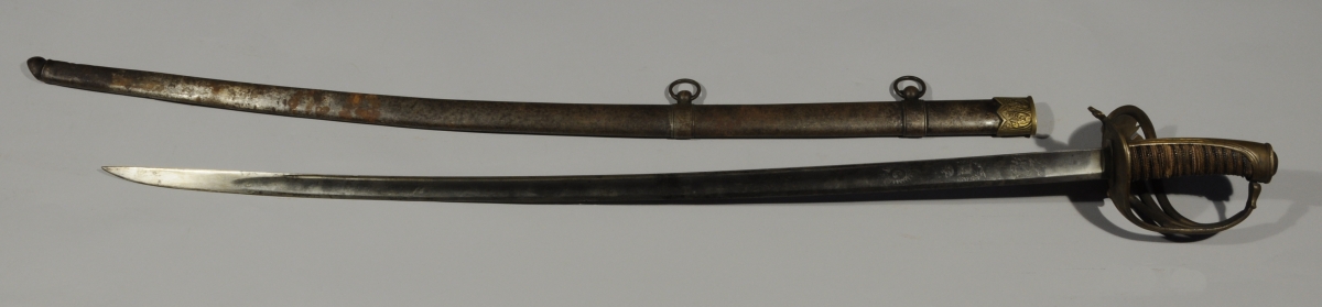 Lame courbe, à dos plat, gravée Manufre Rle du Klingenthal Octobre 1814, à contre tranchant et pans creux, marquée " Garde du Corps du Roi " , lys, trophées, soleil et des " Armes de France. ". Fourreau en tôle de fer à deux bracelets, chape en laiton ciselée de feuilles d'eau.
